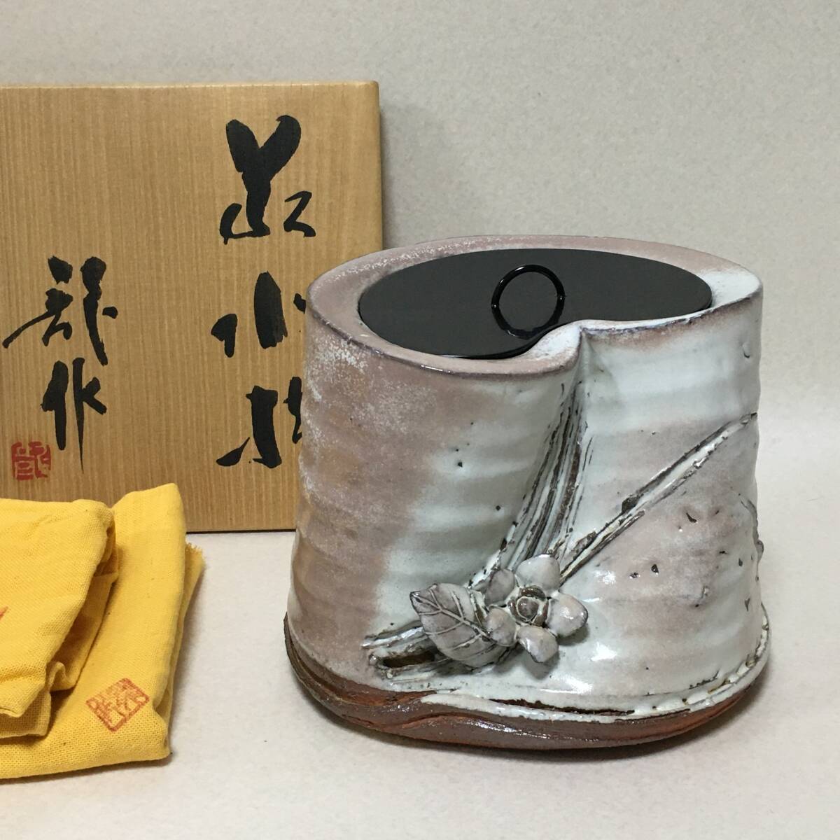 | * 商品説明 * 水指:保管品で状態良好です。 黄布・箱:割といい状態です。 サイズ:高さ17.5㎝ 直径21.5㎝ サイズにつきましては若干の誤差があるものとお考えください。