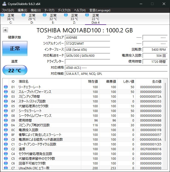 | 送料無料!使用少 1,720時間!【動作確認済 S・M・A・R・T値正常 1TB 1,000GB】 2.5インチSATA HDD 東芝(TOSHIBA)製 MQ01ABD100 | |