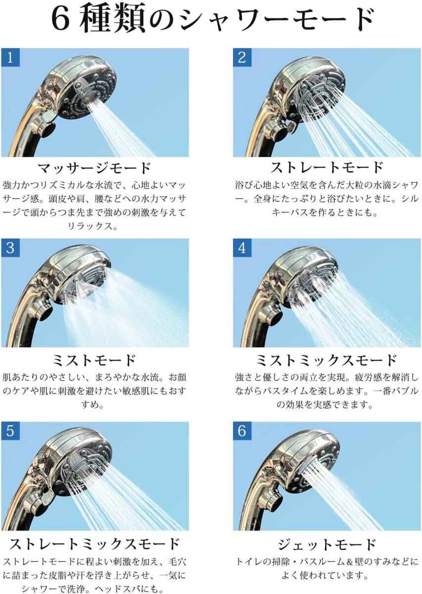 【目的にあわせて選べる6つの水流モード】:シャワーヘッド一つで全身をケア、浴びる部位や目的に合わせて選べる6つの水流モードで手元で簡単に切り替えできます。①マッサージモード:強力かつリズミカルな水流で、心地よいマッサージ感。頭皮や肩、腰などへの水力マッサージで頭からつま先まで強めの刺激を与えてリラックス。②ストレートモード:浴び心地よい空気を含んだ大粒の水滴シャワー。全身にたっぷりと浴びたいときに。シルキーバスを作るときにも。③ミストモード:肌あたりのやさしい、まろやかな水流。お顔のケアや肌に刺激を避けたい敏感肌にもおすすめ。④ミストミックスモード:強さと優しさの両立を実現。疲労感を解消しながらバスタイムを楽しめます。一番バブルの効果を実感できます。⑤ストレートミックスモード:ストレートモードに程よい刺激を加え、毛穴に詰まった皮脂や汗を浮き上がらせ、一気にシャワーで洗浄。ヘッドスパにも。⑥ジェットモード:トイレの掃除・バスルーム&壁のすみなどによく使われています。