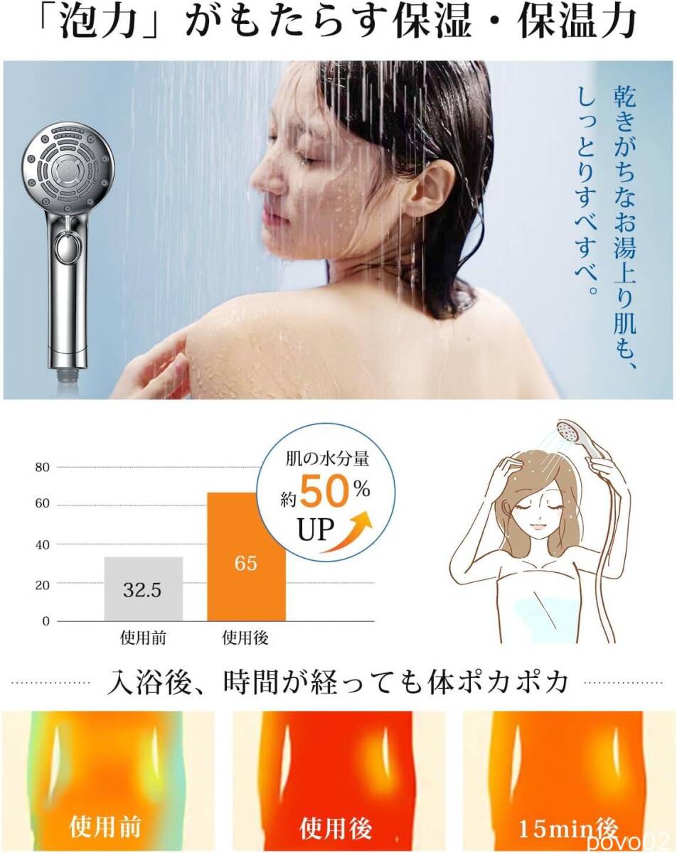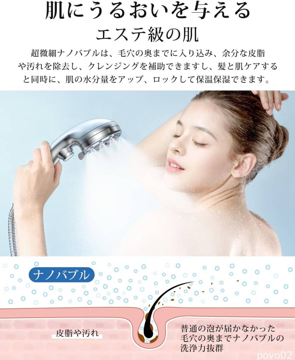 【目に見えないナノバブル&ポカポカ・うるおいで満たされた肌へ】:本シャワーヘッドは先進のナノ技術を駆使し、水流を目に見えない超微細なナノバブルに変え、美肌・美髪効果に優れたナノバブルを最大約6億3500万個放出!肌に深く浸透し、通常の水では落としきれない汚れや油脂を徹底的に除去し、肌の乾燥や粗さをより改善!さらに、普通の気泡と違い、ウルトラファインバブルにてある程度で水温を保つできますので、お風呂時間をより長く楽しめ、肌の水分をしっかりと保持、うるおいと滑らかさを持続し、長時間の入浴で一日の疲れを癒せ、肌を生まれ変わらせるSPA体験となります!