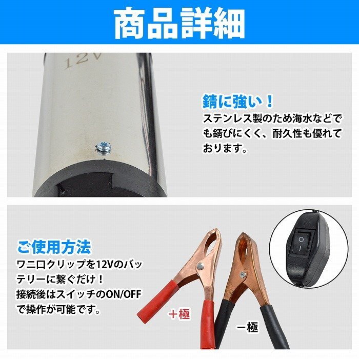 【仕様】電源:DC12V/材質:ステンレス/バッテリークランプ(ワニ口クリップ)式