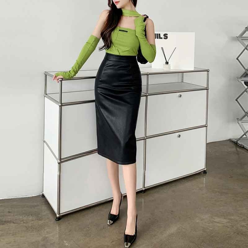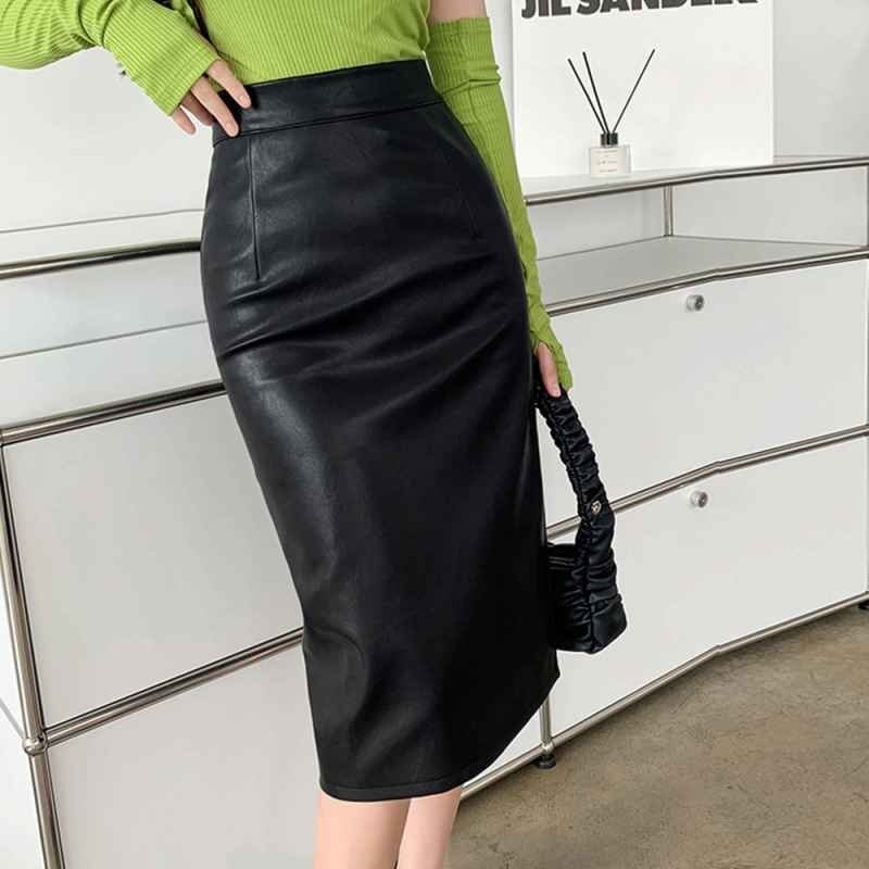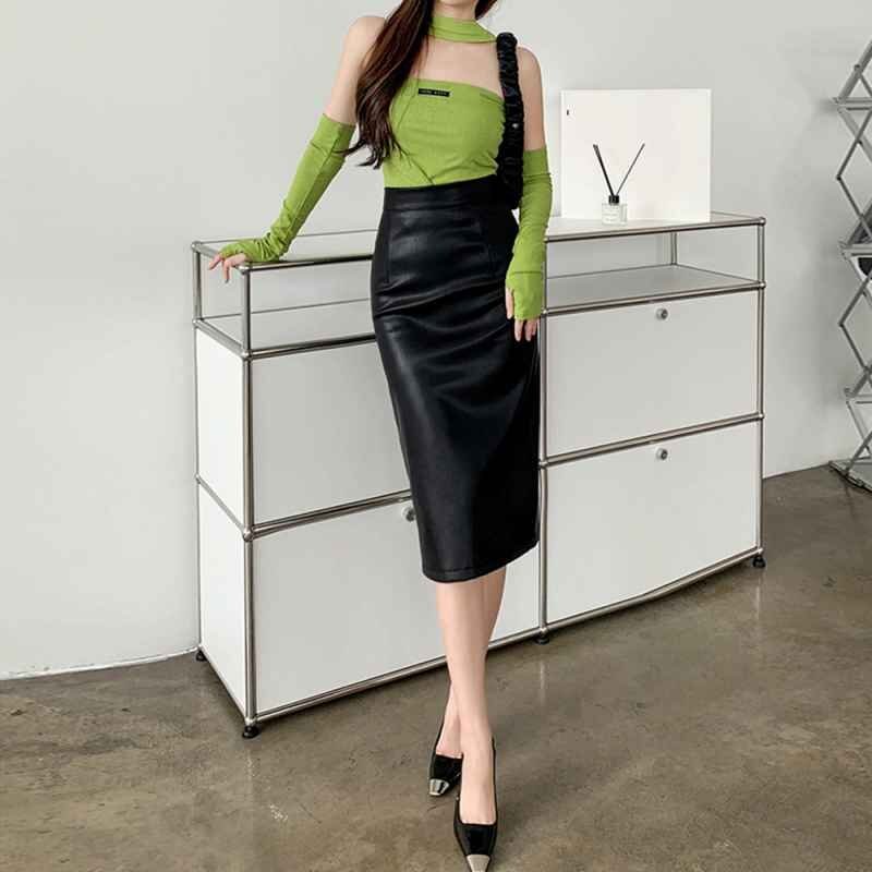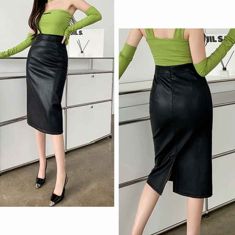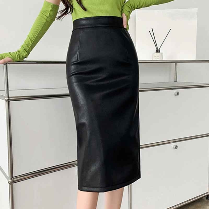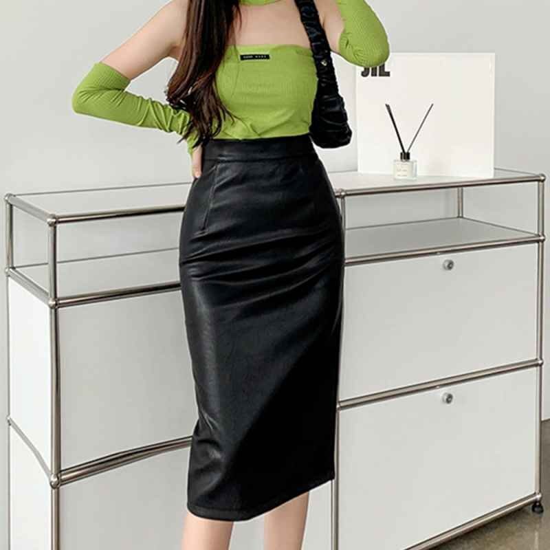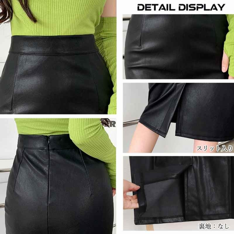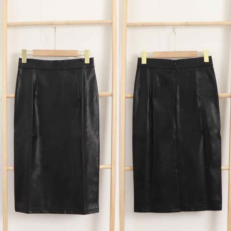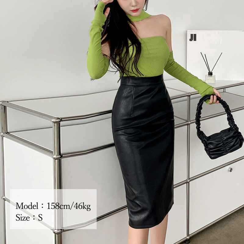 やわらかく滑らかなフェイクレザーを使用、シンプルなPUレザータイトスカート。後ろ裾にスリット入り仕様、歩くたびに微かに見える足のラインがさりげなくセクシーさを演出します。