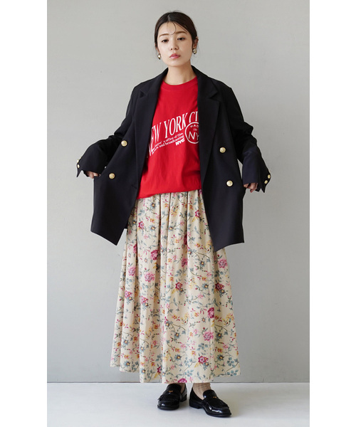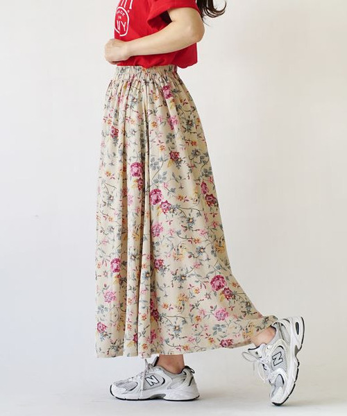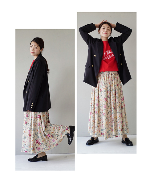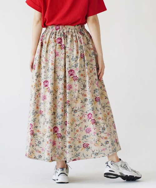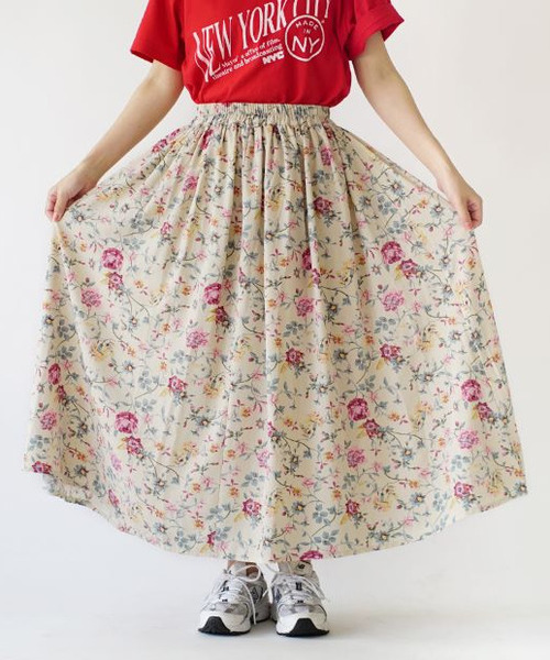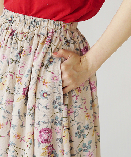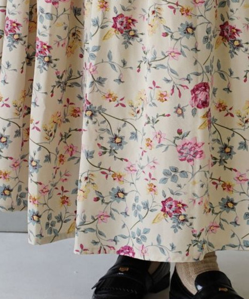 立体的なヘリンボーン模様が織られ、表情のあるスカートにアンティークな花柄をプリント。
