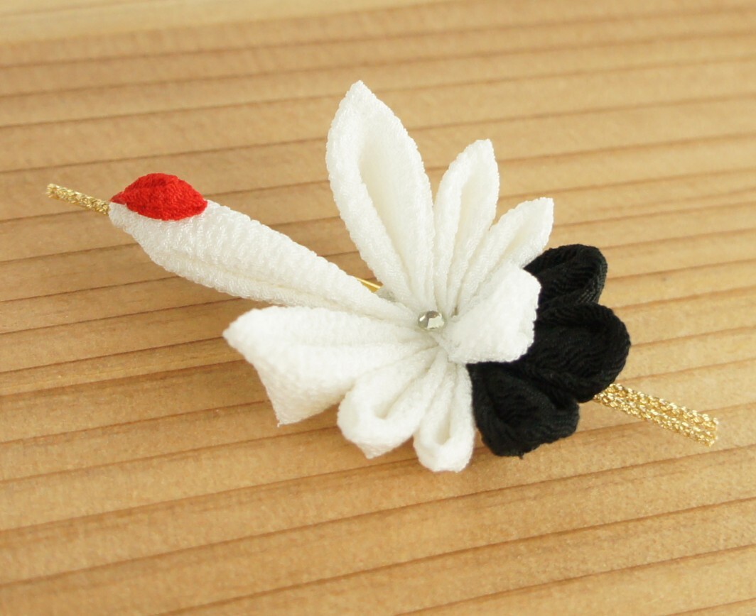 ♪ ハンドメイド  ブローチ  ツル 鶴 つまみ細工 ちりめん 高分子結晶ストーン使用