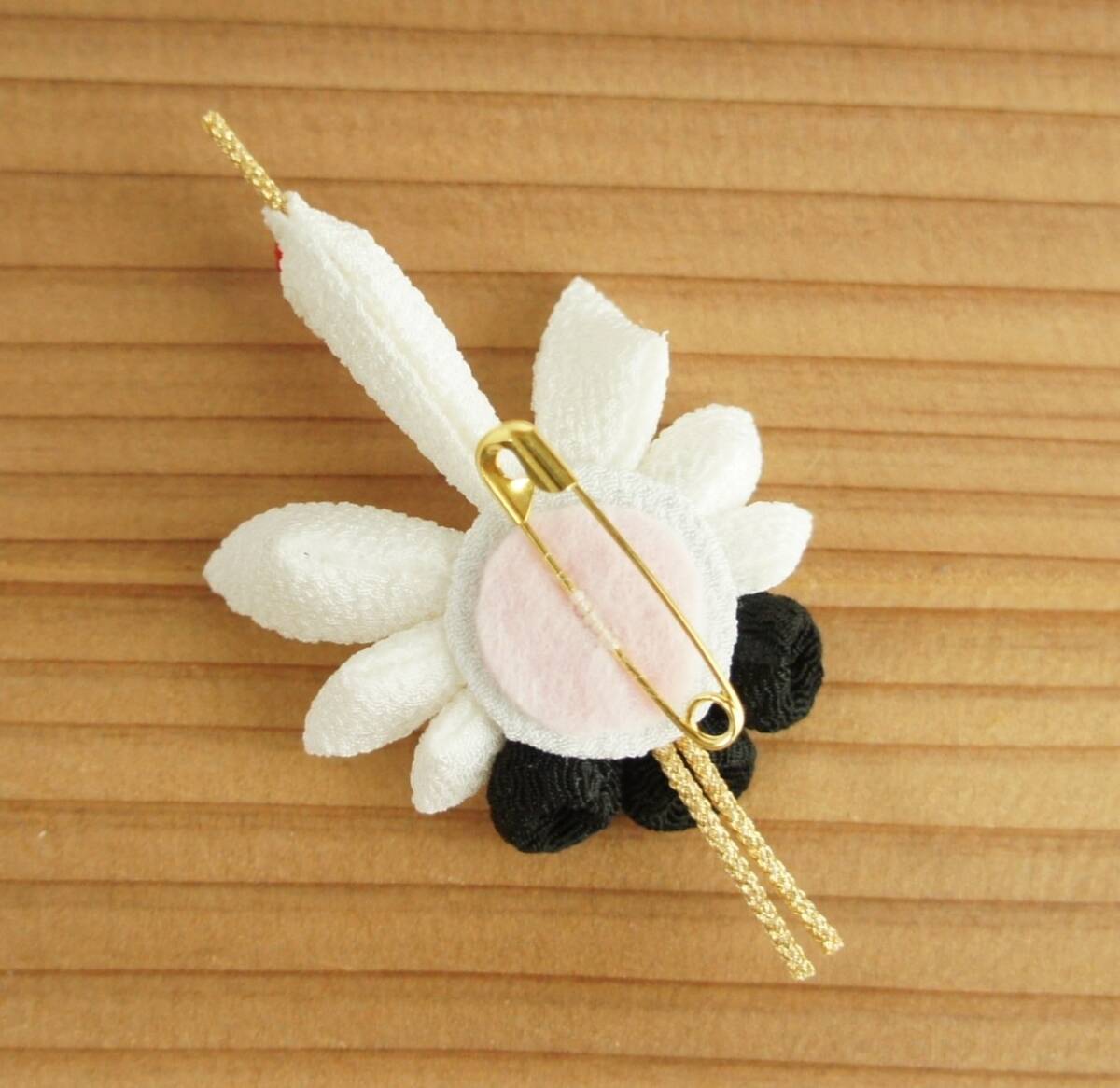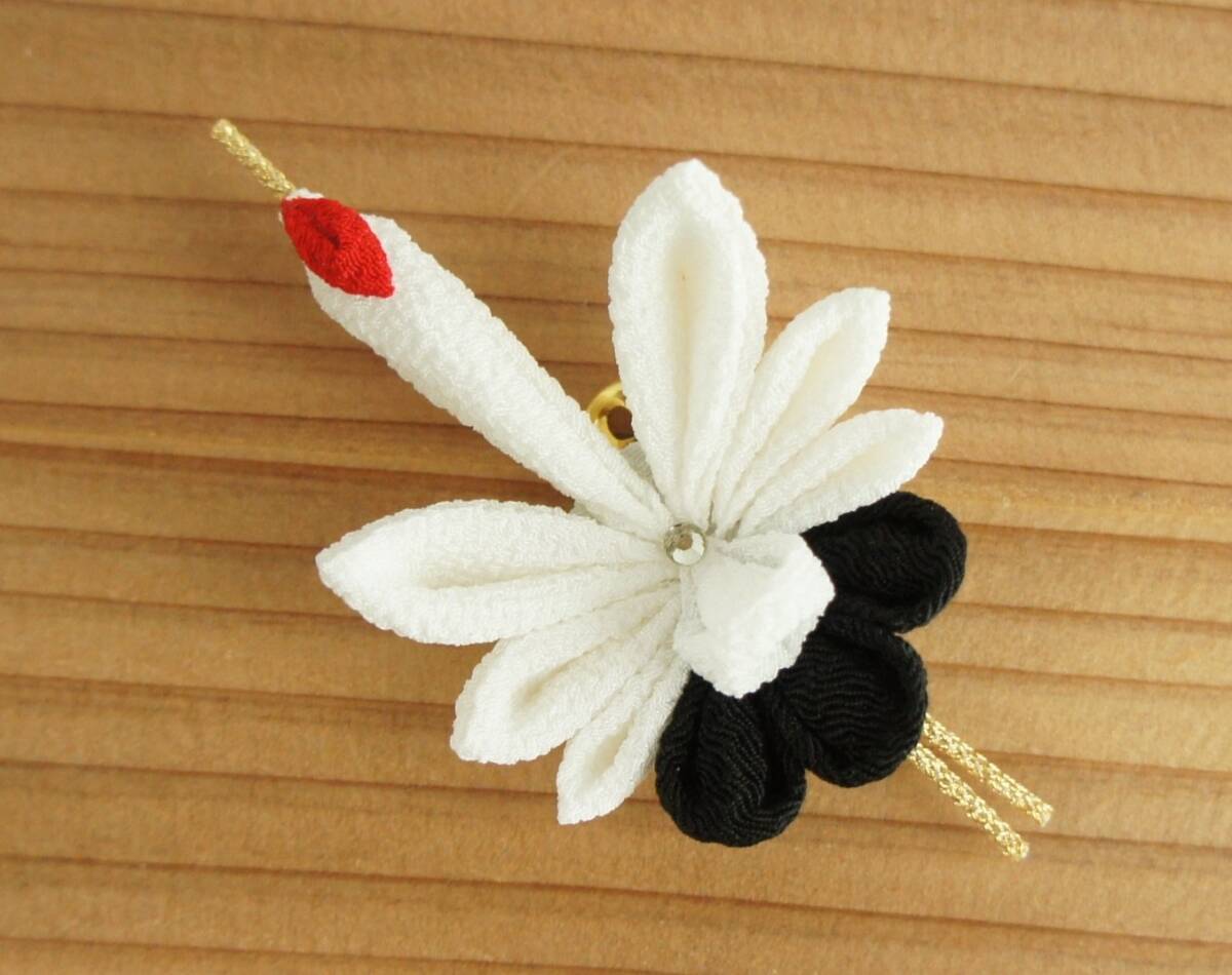 ハンドメイド  ブローチ  ツル 鶴 つまみ細工 ちりめん 高分子結晶ストーン使用