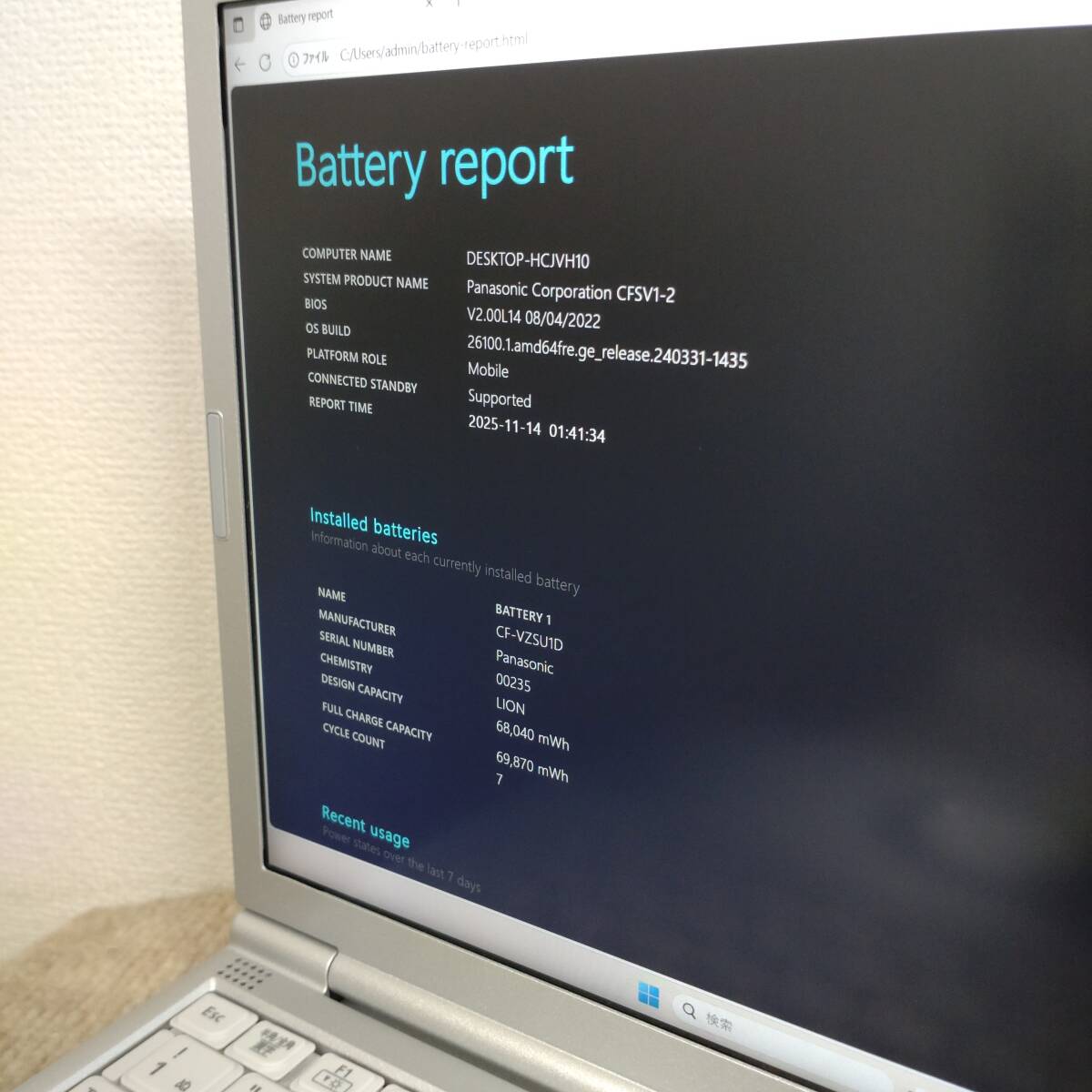 画像のようにバッテリーリポート機能により状態を確認しました。