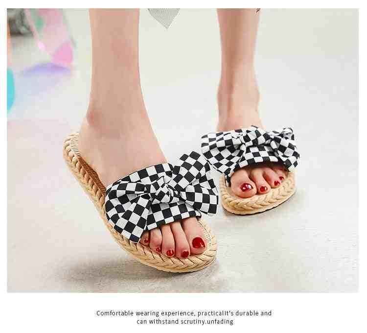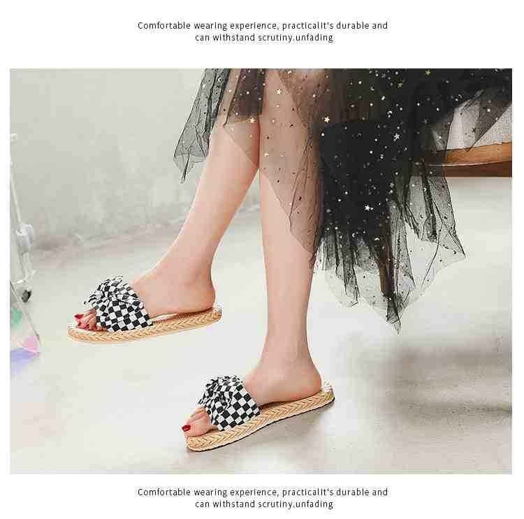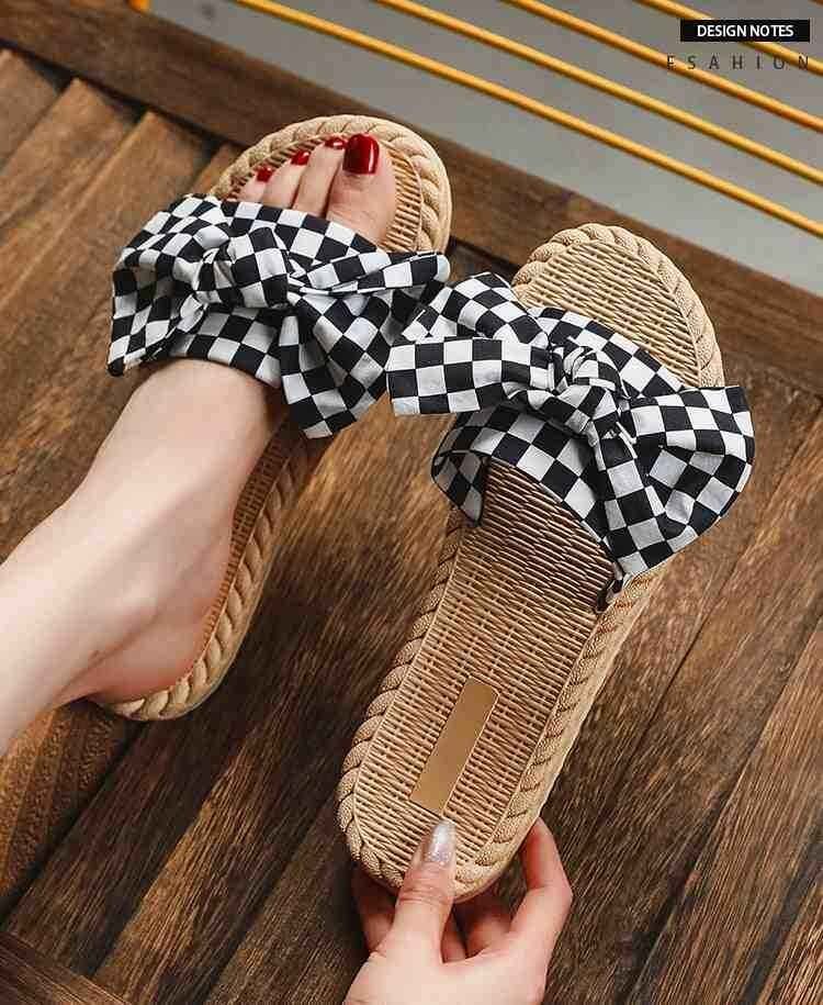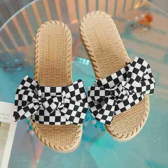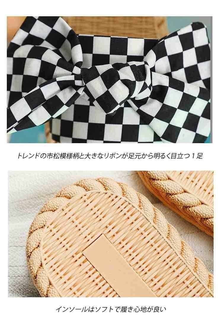 市松模様柄と大きなリボンが華やか フラットミュール