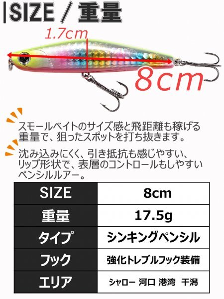 ・空気抵抗の少ないスモールボディーと重量の抜群のバランスで、ロングキャストを可能とし広範囲が探れます。