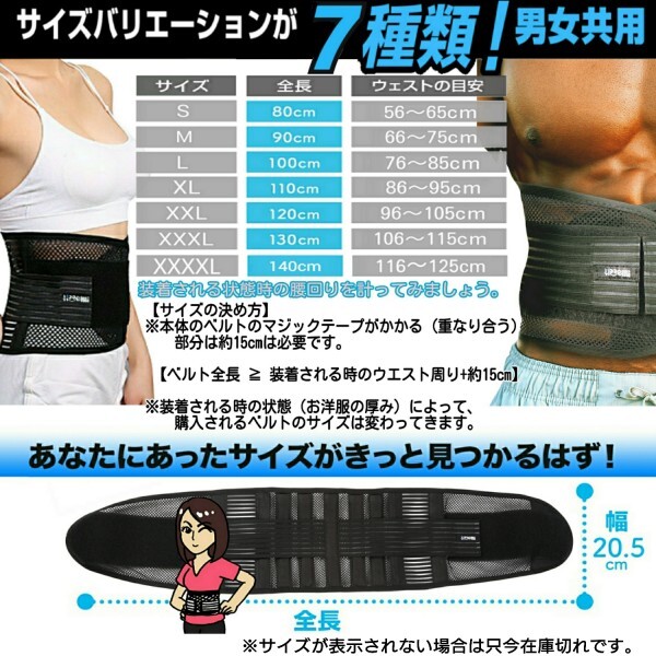 数あるオークションの中から、アクセス頂きありがとうございます。 【日常が変わる!毎日が笑顔になるオリジナルベルトはあなたの元気を取り戻します!】 ・丈夫なメッシュ素材で通気性、耐久性抜群! ・こちらはXLサイズのご案内になります。(豊富な8サイズを展開!) サイズ:XLサイズ 横:全長約110cm(腰周り:約86~95cmまで対応) 幅:約20.5cm 材質:ポリエステル65%・コットン35% カラー:ブラック (サイズ表も合わせてご覧くださいませ) ・Wベルトとマジックテープでしっかりホールド&加圧! ・医療用特殊樹脂ボーン採用だから驚きの軽さで、しっかりサポート! ・ボーンの本数が調節可能な為、ご自身の体調やご 使用環境に応じてホールド感の調整が可能です! 【こんな方にオススメです】 長時間のデスクワーク、立ち仕事、ヘルニアやぎっくり腰、 関節痛などの不安がある方、日常的に腰のサポートをしたい、 ウエストのシェイプアップなど、幅広く様々な方にご利用いただけます。 【特徴】 ・二段式ベルトの長さ、ボーンの間を日本人体型にリサイズしました。 ・ボーンが最大5本内蔵でき自由に取り出せるので5→4本など数を変えて 体調やご使用環境に応じてお使いになれます。 ・丈夫なメッシュ素材を採用しているので、通気性はもちろん耐久性にも優れています。 ・洗濯機で洗えるのでお手入れが楽! 【特典もついてくる】 ・オリジナル収納ポーチが付属! ・購入者だけの特典漫画で解説日本語説明書付き! ・100%安全保証!サイズ交換ももちろんOKです。 ※3Dボーンを装着しての激しい動きには向いておりません。ご注意願います。