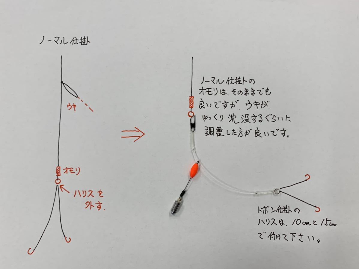 ノーマル仕掛けのハリスを外してドボン仕掛けに、ハリス長さ、10cmと15cmで付けて下さい。