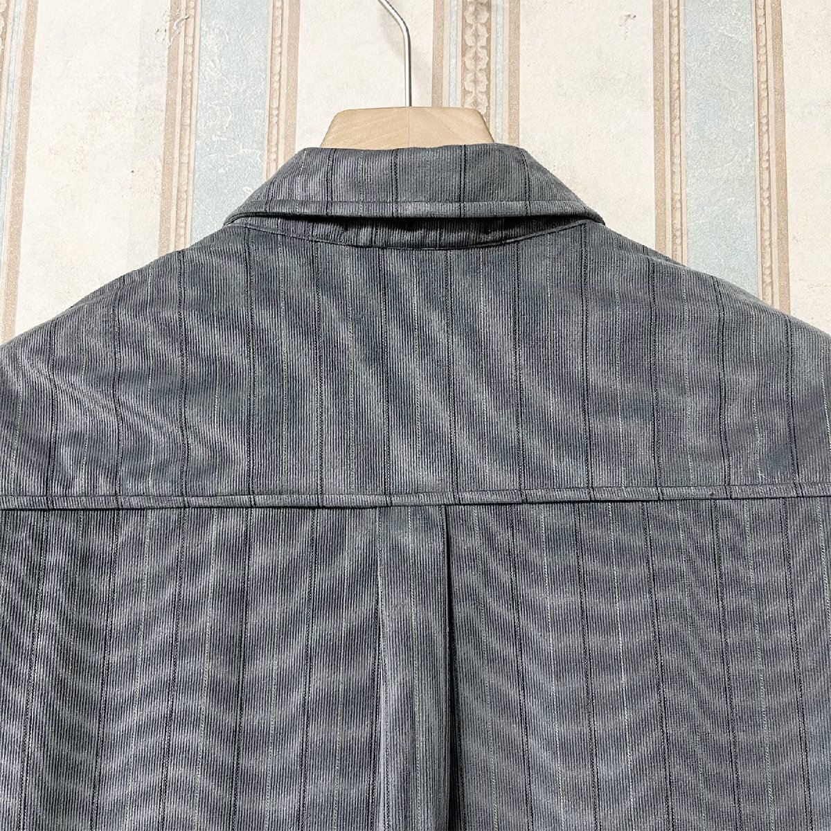 全体にあしらわれた繊細なストライプ柄が、上品かつスタイリッシュな印象を演出。フロント部分には印象的なプリントが施されており、シンプルながらも個性を引き立てます。左胸には実用的なポケットを配置しており、デザインのアクセントとしても機能性としても優れています。フロントはボタンを配置して、開けても閉めてもスタイリッシュに影響なく、自分の好みより調整できます。