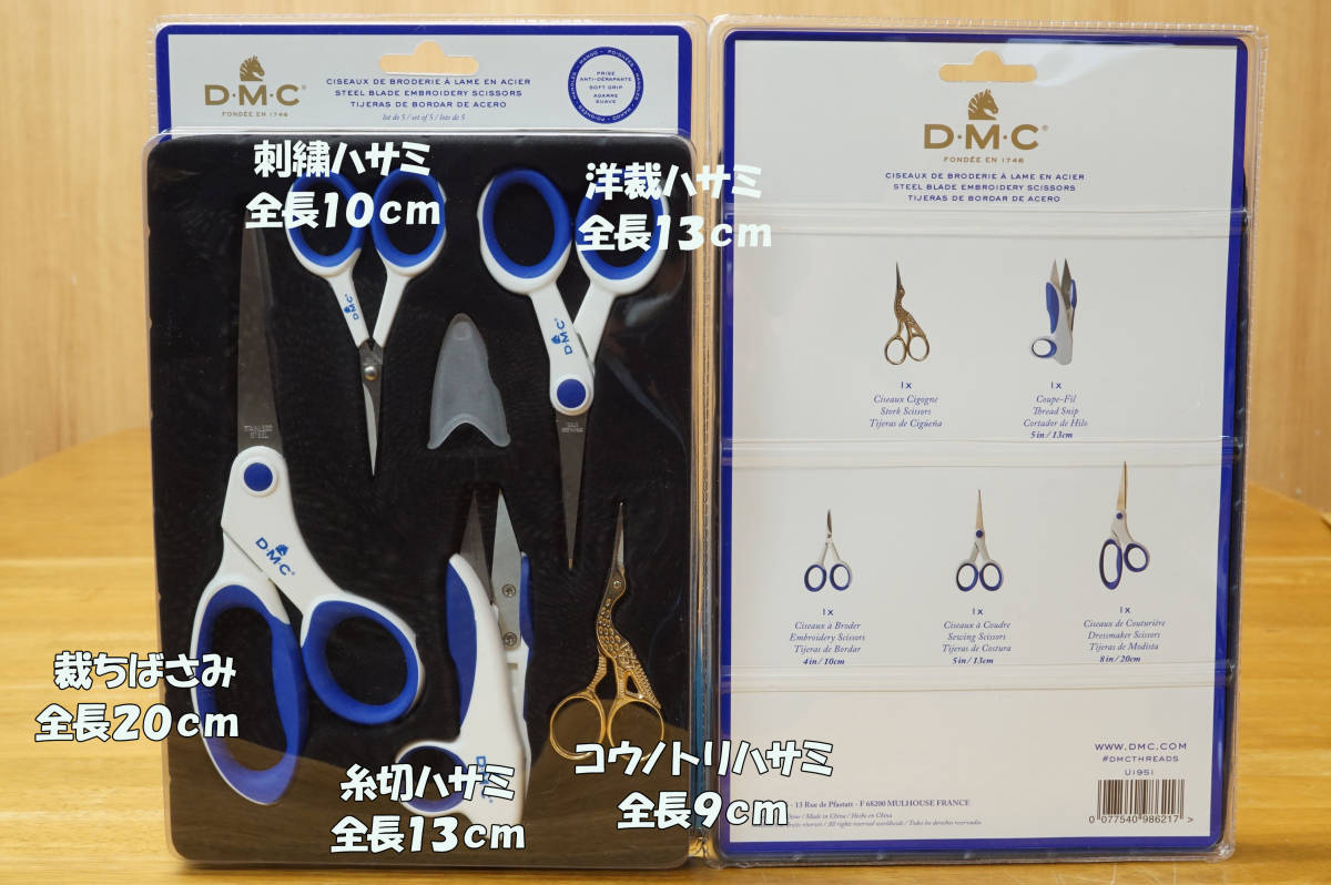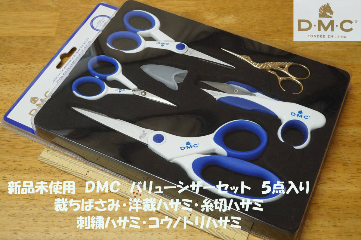 商品は、新品未使用、ソフトグリップで使い手に優しいお得なDMCの手芸ハサミ5種組で、裁ちばさみ・洋裁ハサミ・糸切ハサミ・刺繍ハサミ・コウノトリハサミでございます。シンプルに統一されたデザインで、個人用のスターターセットやギフトなどにも是非、ご利用ください。