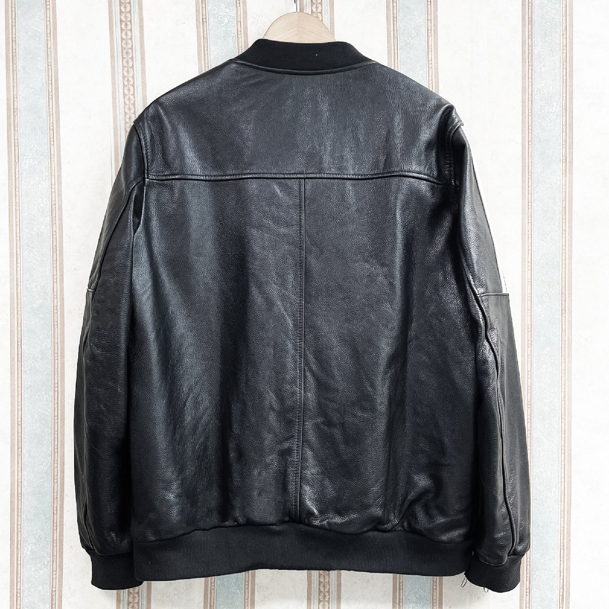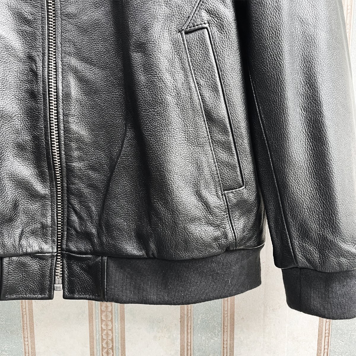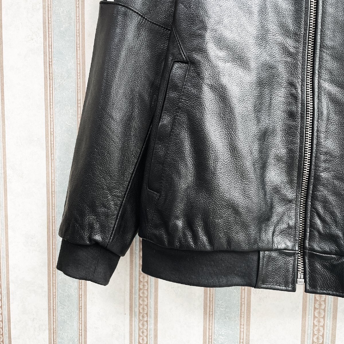 厚すぎず薄すぎない安心感のある程よい厚みの素材です。使いやすく、合わせやすい。後ろ姿もキレイなレザーブルゾン。裏地付きで袖通しもなめらか。さっと羽織るだけでクールに決まる。大胆かつ魅力的でスタイリッシュに男を演出してくれる逸品。ライダースにはもちろん、大人カジュアルにもピッタリの一着です。