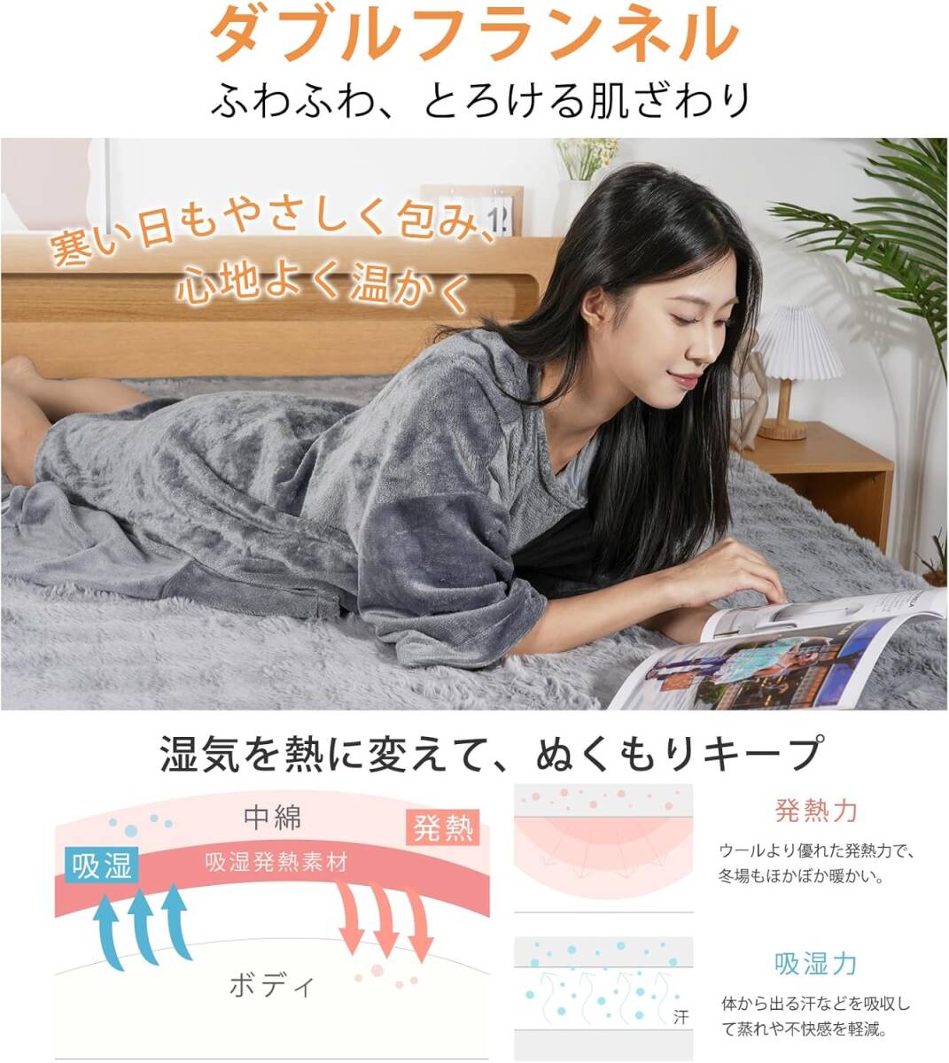 • 【ダブルフランネル×吸湿発熱】ふんわり、しっとり。体の湿気を熱に変える吸湿発熱生地が空気の層をつくり、からだ全体をやさしく包み込みます。※体感は環境や個人差により異なります。