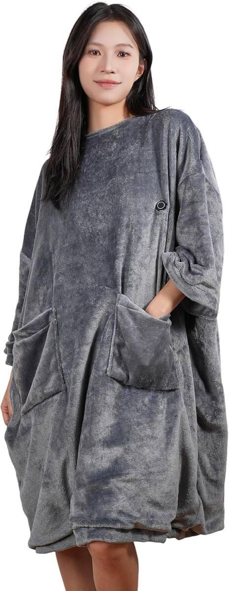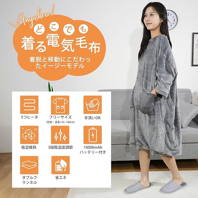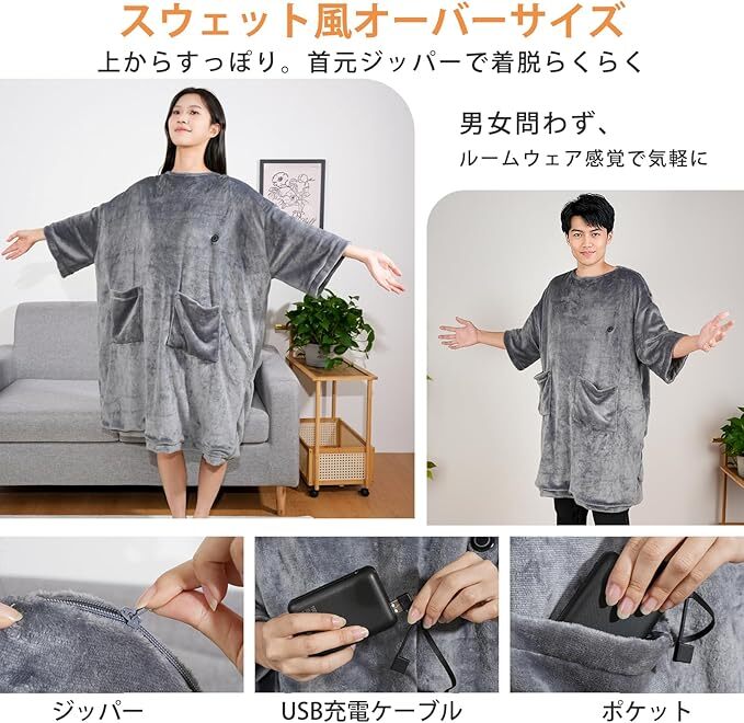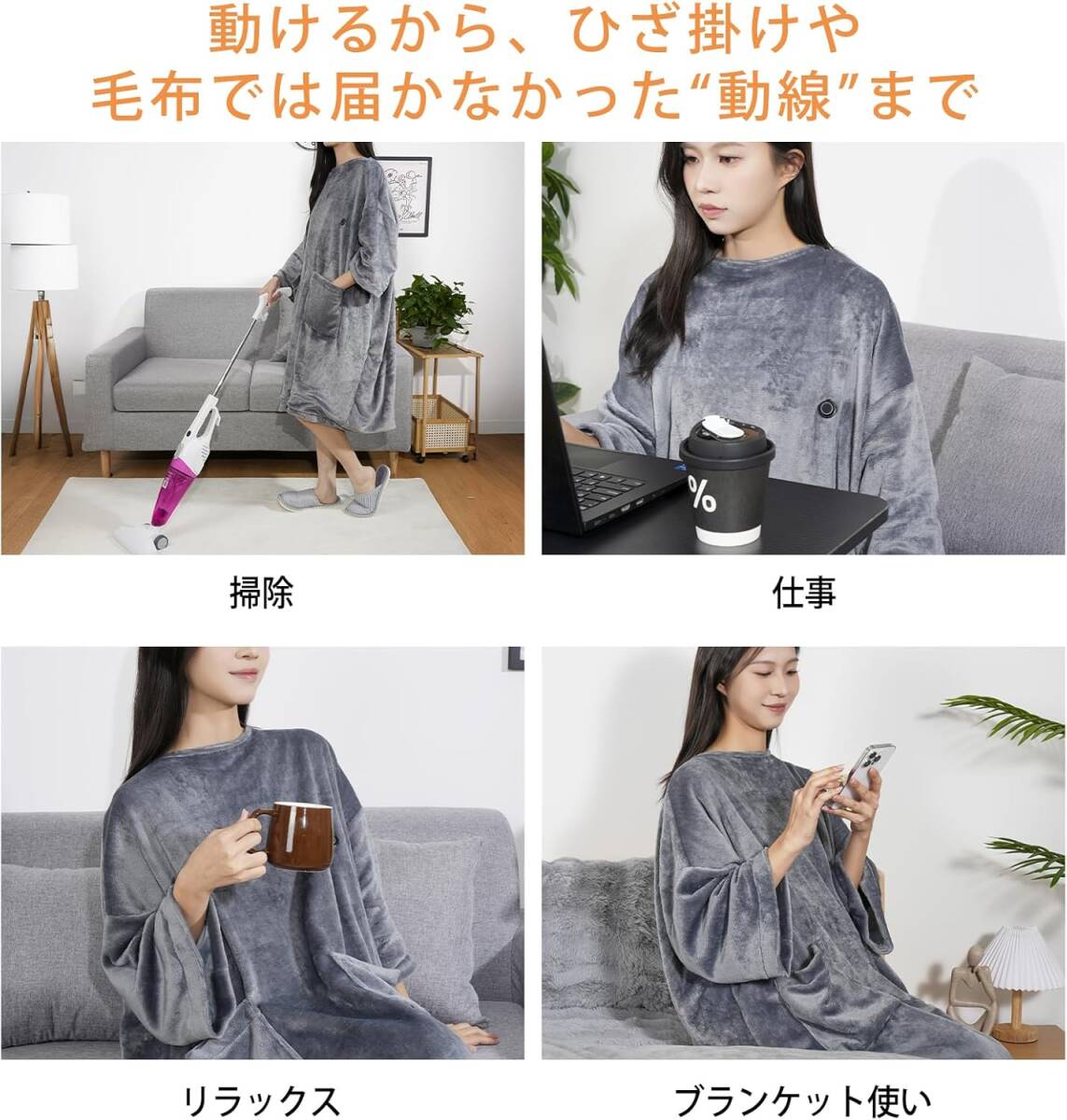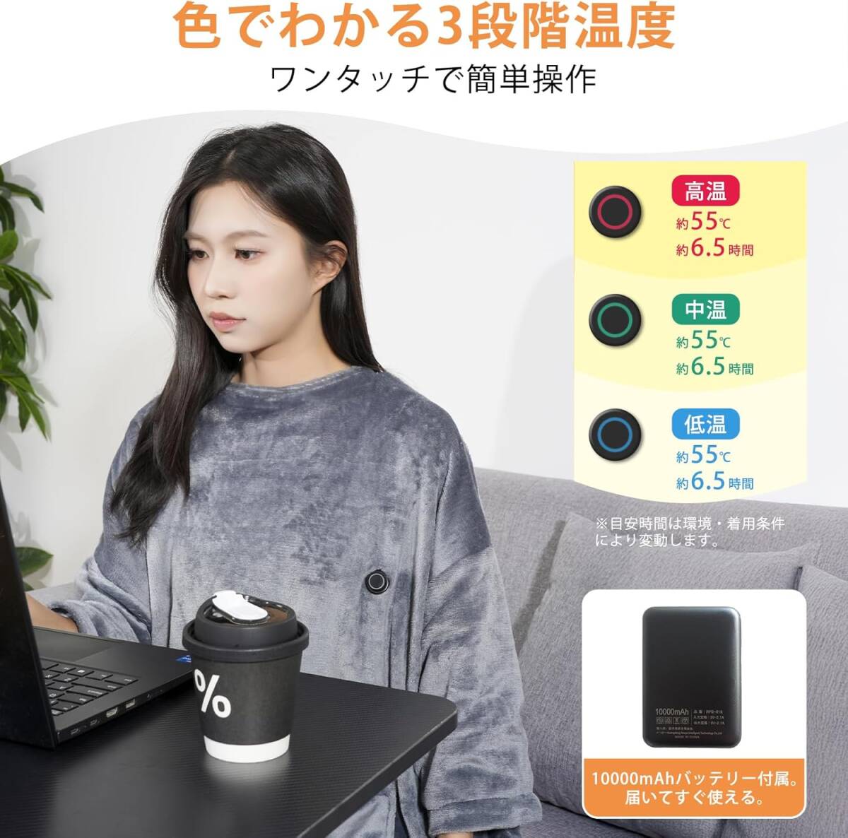 着るこたつ 着る電気毛布 USB レディース メンズ 3段階温度調節 2層構造フランネル 吸湿発熱 10000mAhバッテリー付き 手洗い可能 電気ブランケット まるでこたつ 省エネ フリーサイズ 135~180cm身長に適応 グレー