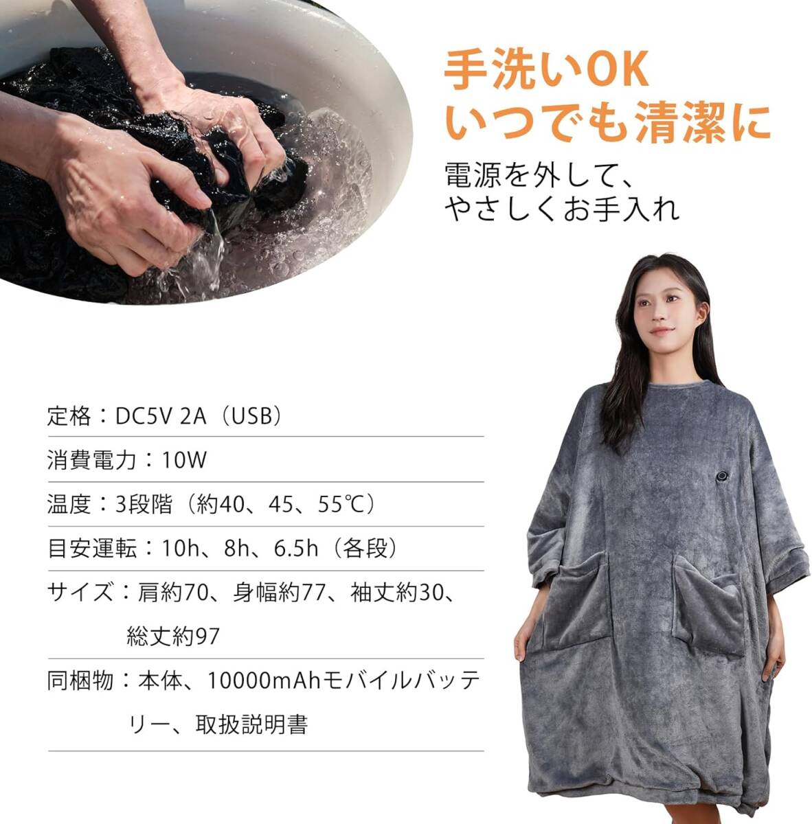 • 【サイズ・仕様】フリーサイズ(ユニセックス):肩幅約70cm/身幅約77cm/袖丈約30cm/総丈約97cm。素材:ダブルフランネル(吸湿発熱)。同梱物:本体、10000mAhモバイルバッテリー、取扱説明書。給電:USB(Type-A)。