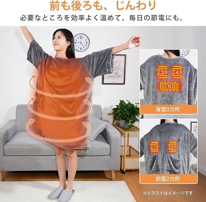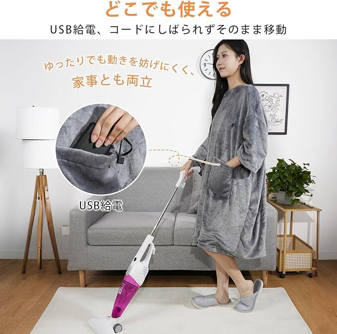1363 着る電気毛布 着るこたつ USB 3段階 2層構造フランネル 吸湿発熱 手洗い可能 電気ブランケット 省エネ フリーサイズ 135~180cm グレー