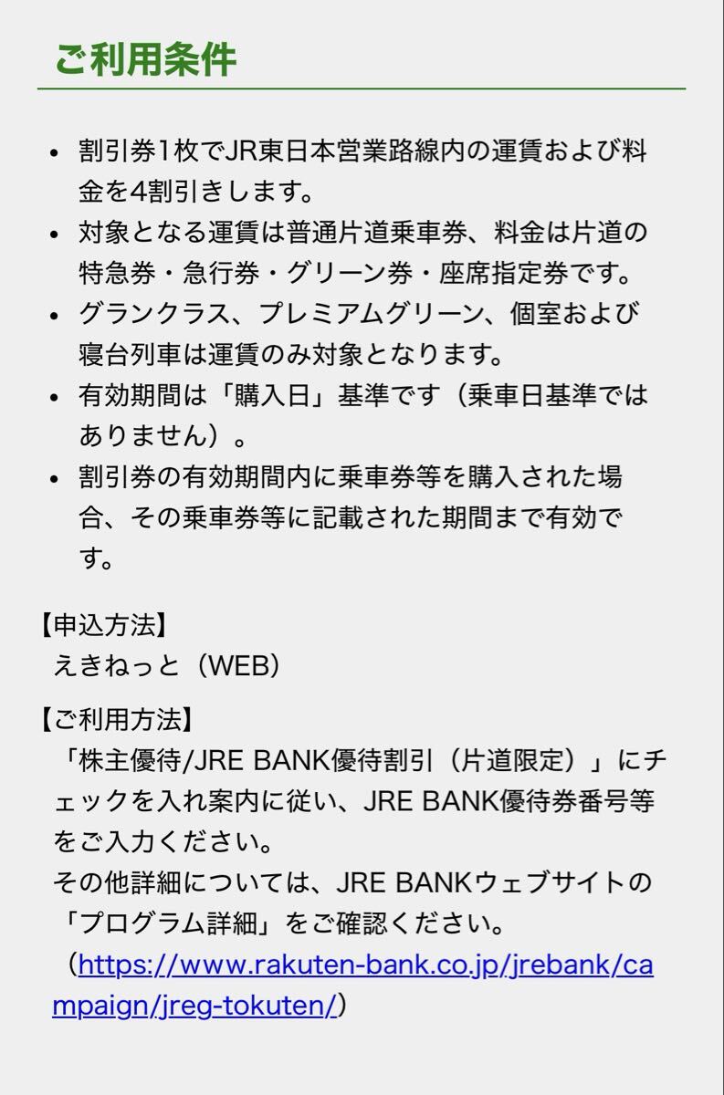 JR東日本内の切符購入の際に利用出来るJRE BANKの優待割引券になります。詳しい利用条件については画像で確認お願いします。