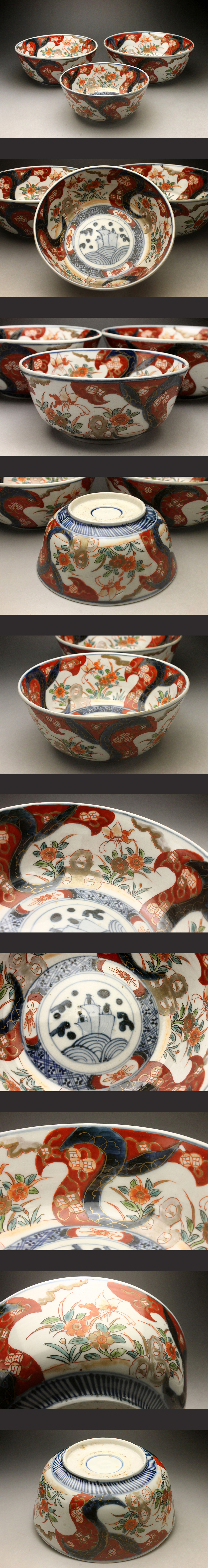 【余韻】 古伊万里 色絵金襴手 船花鳥文 三つ組鉢★時代物 無傷美品 <同梱可>