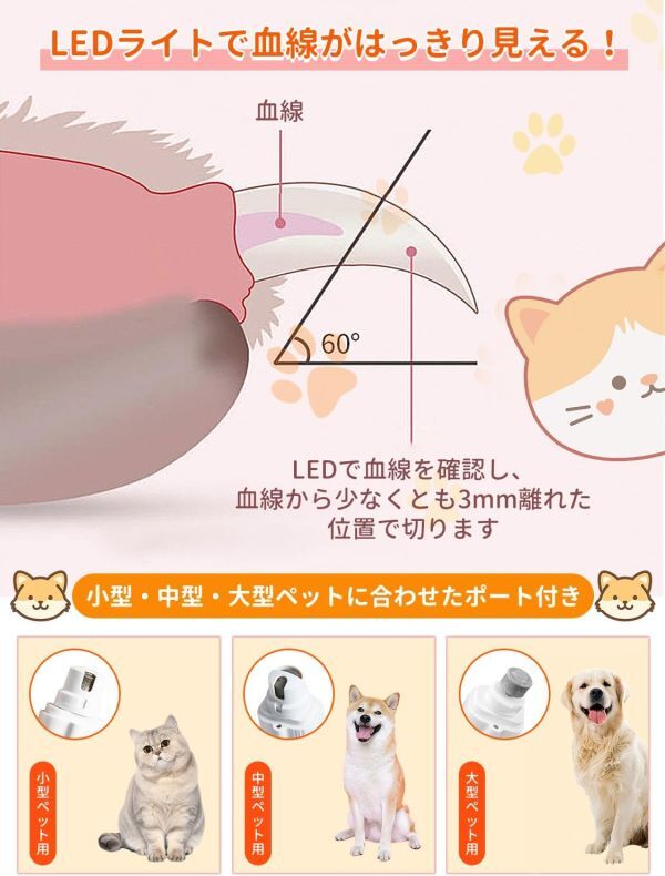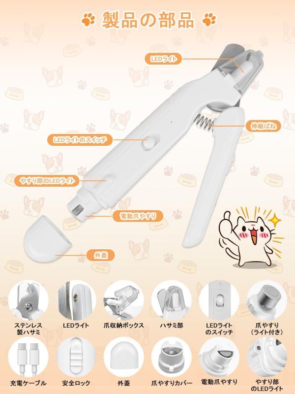 高品質ステンレス刃・LEDライト付き耐久性に優れたステンレス鋼刃を採用。なめらかな切り口カーブ刃と爪の形に合わせた曲線刃設計で鋭利さと耐久性を兼ね備えています。さらに、高輝度LEDライトを搭載で、血線をクリアに可視化し、暗い場所でもペットの爪の内部構造を鮮明に確認できます。深爪防止で猫、犬、うさぎ、ハムスターなど様々なペットに対応し、ペットの安全を最優先に考えた安心設計です。