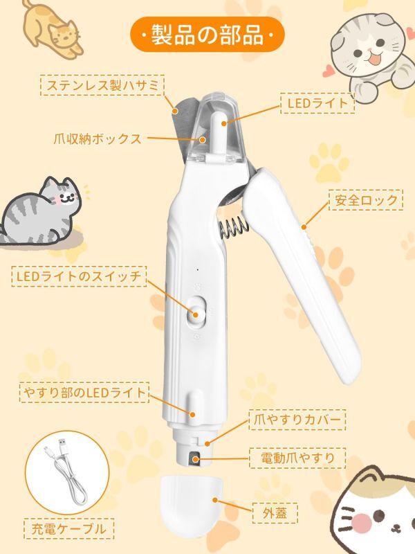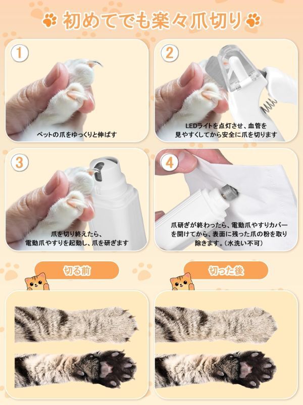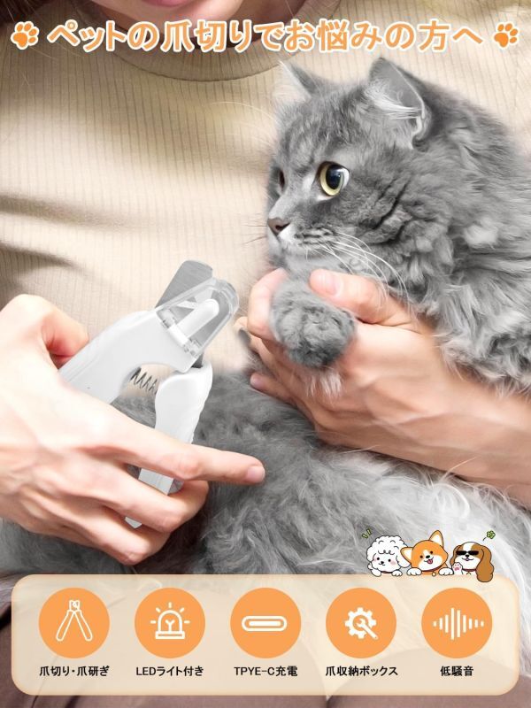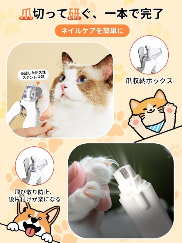 爪切り電動爪やすり一体型爪切りと爪研ぎが1台で完結する便利な設計で、切り終わったら、簡単なスイッチ操作で爪研ぎモードに切り替え可能です。最適化された研磨速度で、小型ペットから大型ペットまで幅広く対応できます。従来の手動やすりと比べて、時間と労力を80%削減しました。ペットが爪切りに慣れるコツは、前もって見える場所に置いておくこと。これでストレスなく爪切りができます!