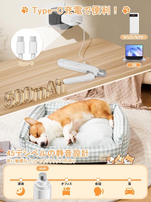 静音革命・TYPE-C充電45dB以下の超静音モーターを搭載。図書館並みの静かさで、音に敏感なペットでもリラックスして爪切りが可能。独自の振動低減技術により、ペットのストレスを最小限に抑えます。TYPE-C充電を搭載し、いつでもどこでも爪のお手入れ!モバイルバッテリーやPCからも充電可能で、外出先でも切れない安心感。ペットの爪ケアが、もっと簡単に、もっと便利に!