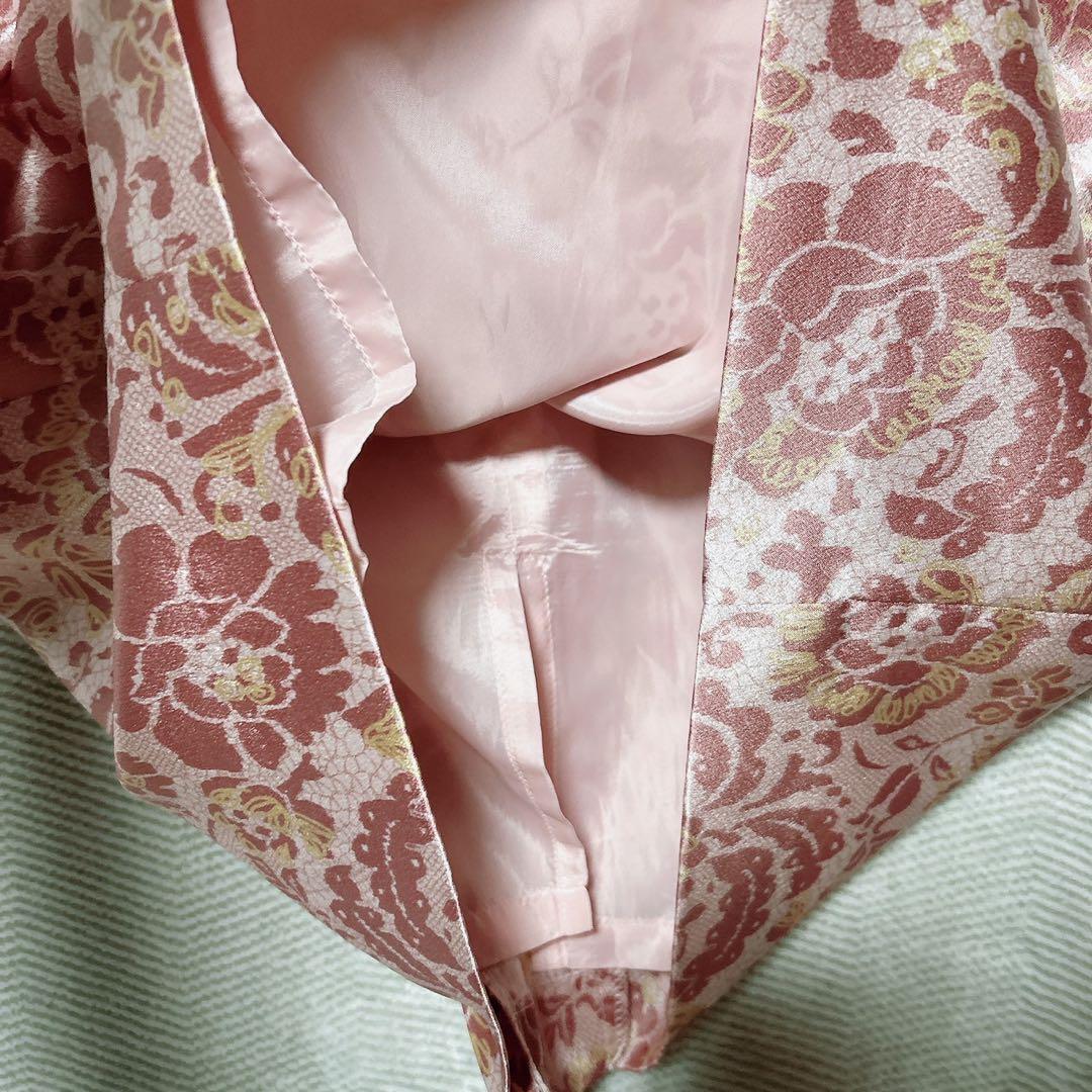 上品なピンクベースにゴールドを織り込んだ華やかな花柄デザインで、光沢感があり特別なシーンにも映えるアイテム。