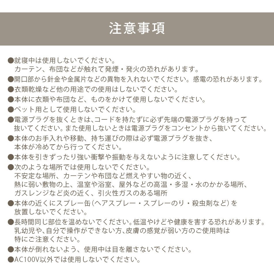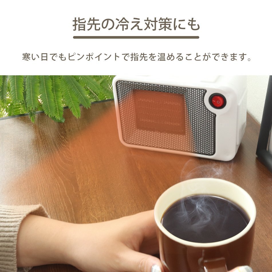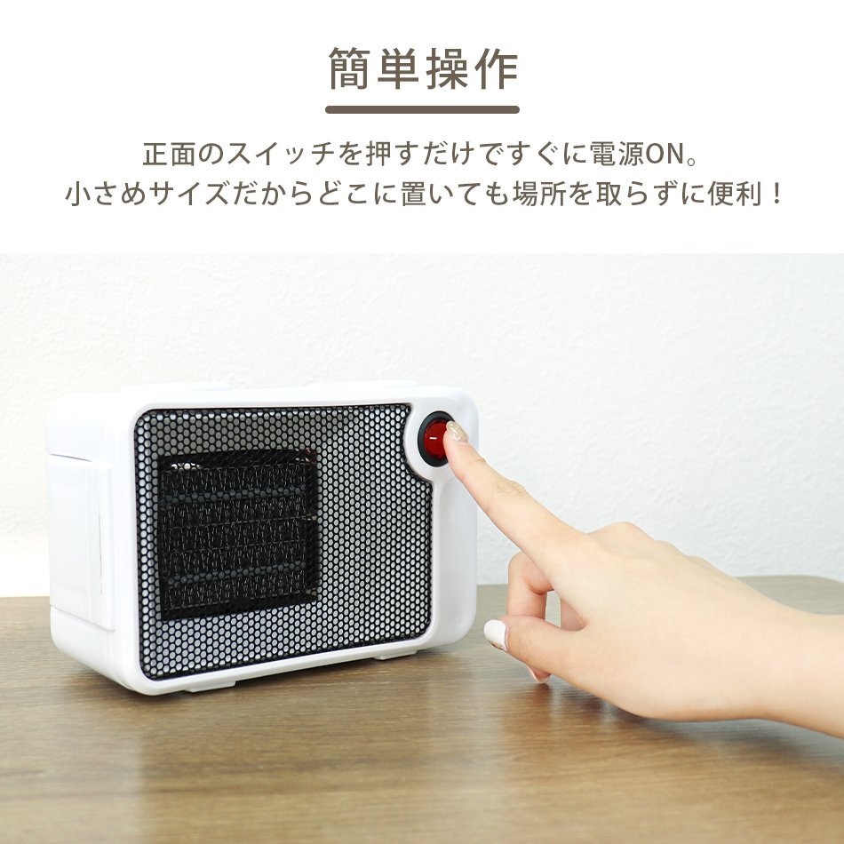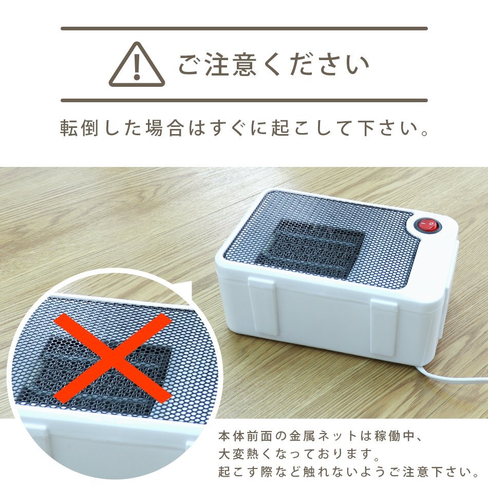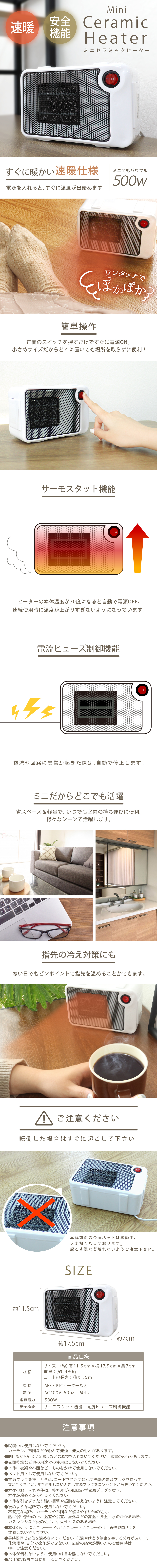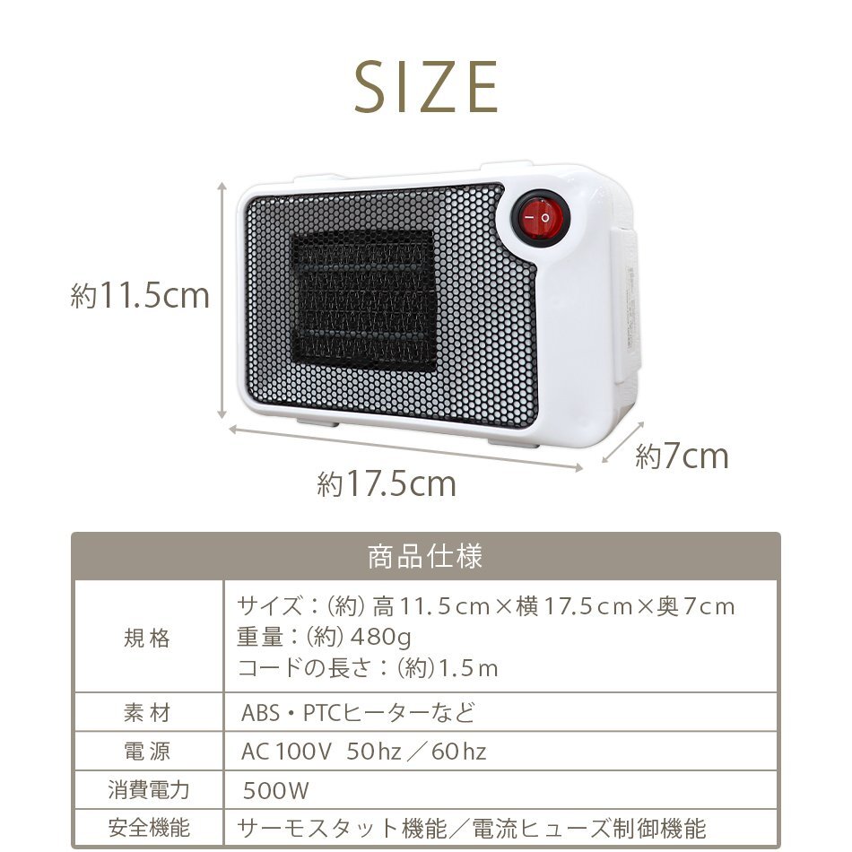 ひとりに1台のコンパクトヒーター! 指先の冷えが気になる方は、デスクの上に置くのもおすすめ。 部屋間の持ち運びもしやすく、狭いトイレや脱衣所などでの使用にもおすすめです!! 【商品仕様】 カラー:ホワイト サイズ:(約)幅175×奥行70×高さ115mm 重量:(約)480g 消費電力:500W 電源:AC100V 50/60Hz コード長:(約)1.5m 安全機能:サーモスタット機能/電流ヒューズ制御機能 素材:ABS樹脂、PTCヒーター 他 【注意事項】 ・不安定な場所や熱に弱い敷物の上で使用しないでください。 ・商品は、モニターによって色合いが異なって見える場合があります。 ・仕様・デザインは改良のため予告なく変更することがあります。 保証期間 7日 ※使用開始時期や使用期間に関わらず、お買い上げ日から7日間です。 商品到着後から7日を過ぎますと、交換の際の往復送料はお客様負担となりますのでご了承ください。 場合によっては対応出来ないケースもございます。 |