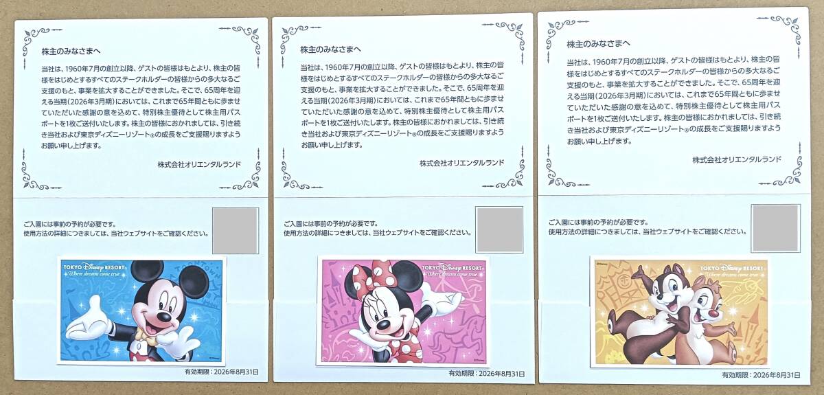 オリエンタルランド 株主用パスポート3枚【有効期限2026年8月31日】東京ディズニーランド 東京ディズニーシー 1デーパスポート
