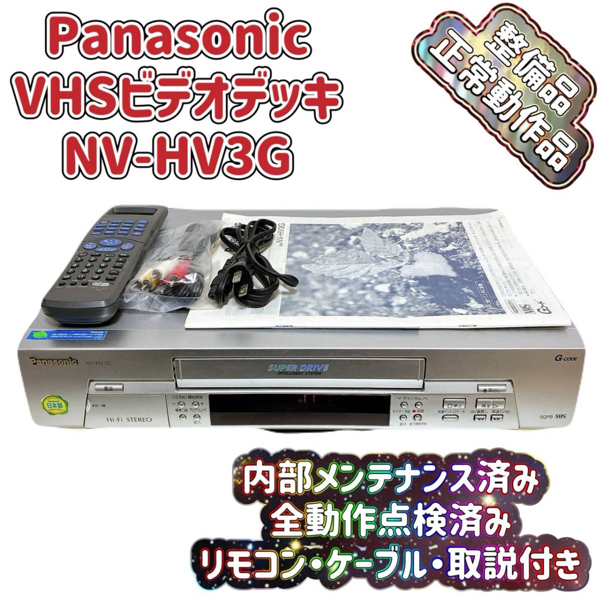 | 商品名 | T09665500【整備品】 Panasonic パナソニック ビデオデッキ VHS NV-HV3G リモコン付 ケーブル付 取扱説明書付 |
