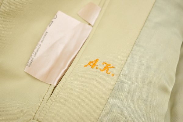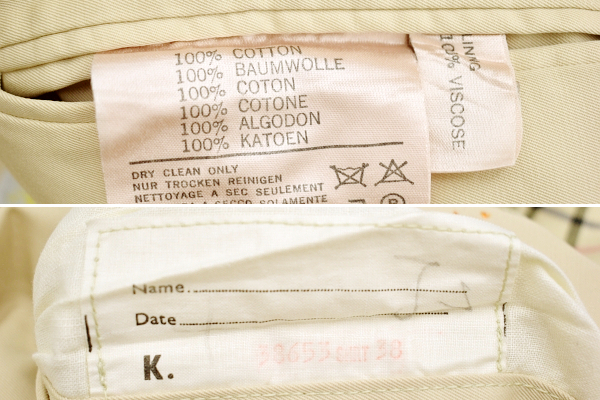 右内ポケット横にイニシャル刺繍があります(着用時は見えませんが、気になる方は、糸切バサミ等で、丁寧に取っていただくか、同色のペンなどで塗りつぶすと目立たないかと思います。)
