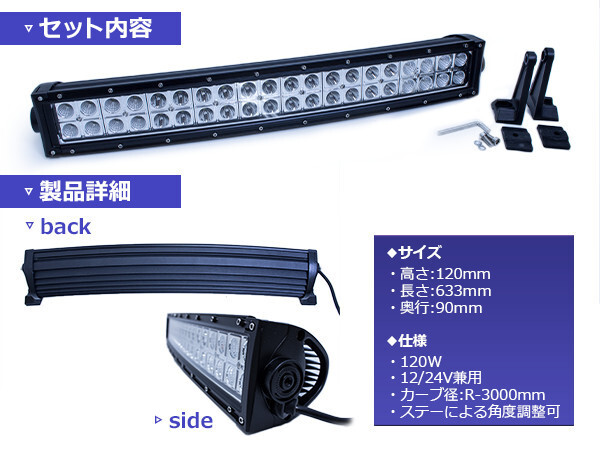 【送料無料】63cm 120W 12v/24v カーブ 湾曲型 横型 LEDライトバー 作業灯 LED ワークライト ロング オフロードランプ 船舶 60cm 600mm
