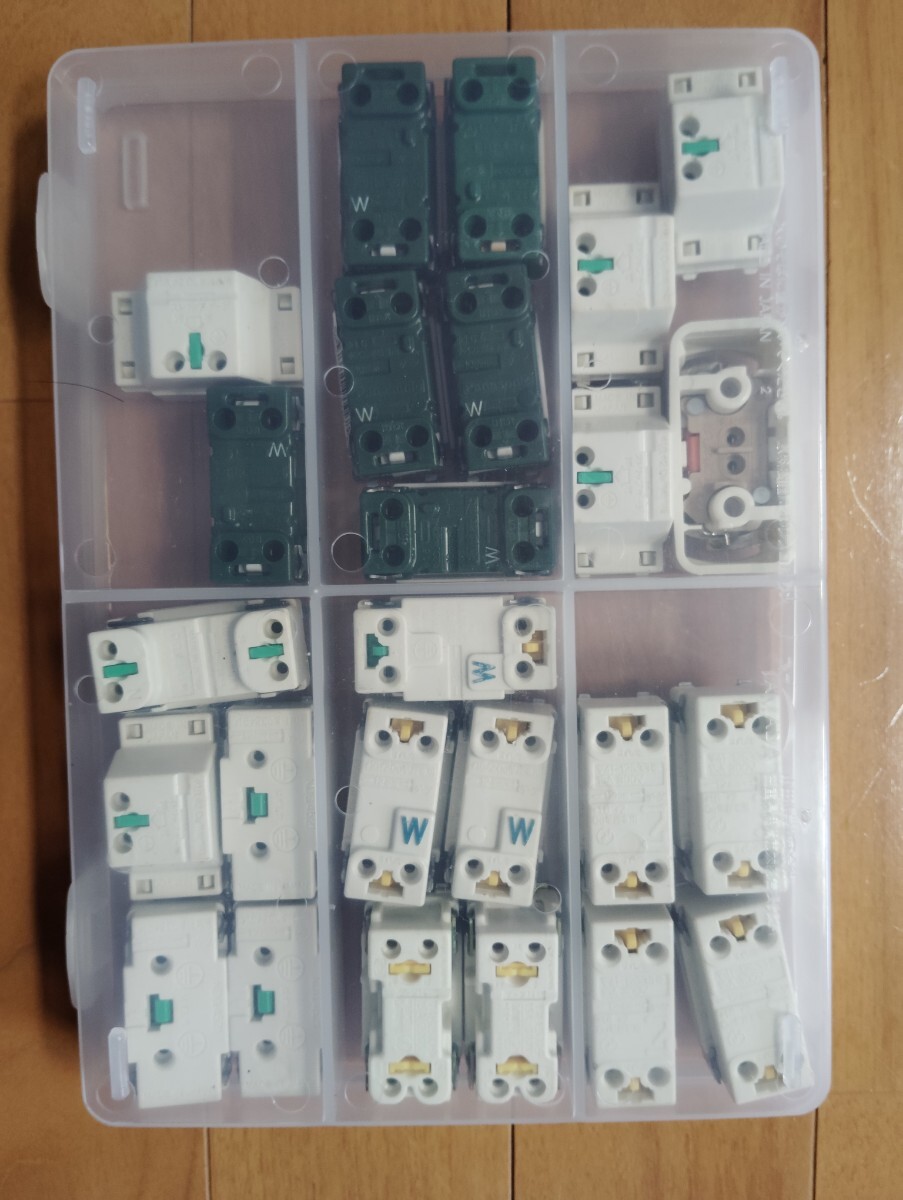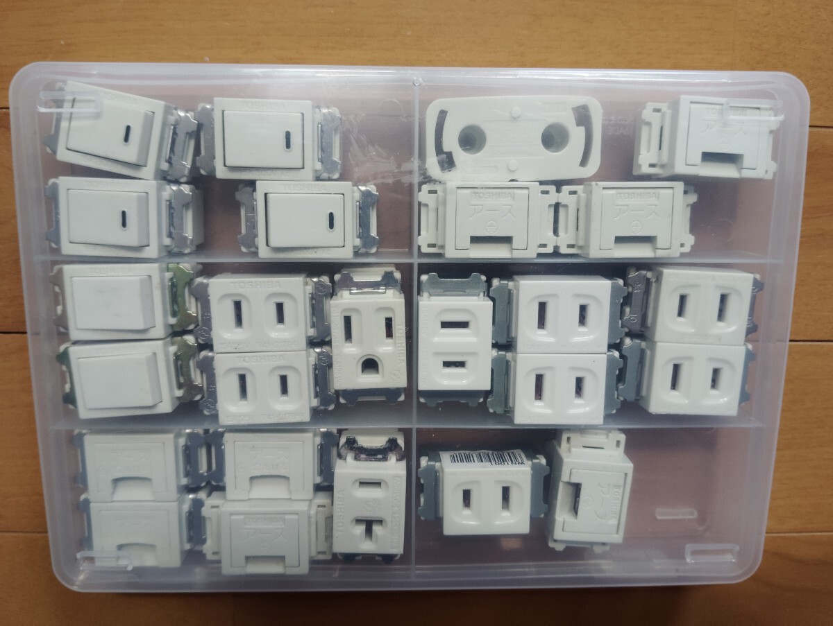 写真の様に各埋め込みコンセント、片切、3路スイッチのナショナル&東芝製になりますが共通性が有ります