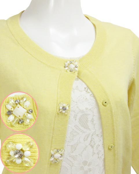 | 明るいイエローとブラウスのアンサンブル。ボタンやポケットにビジューがついていて、華やか。1枚ずつでもセットアップでもお使い頂けて、お得感のあるアイテムです。 |