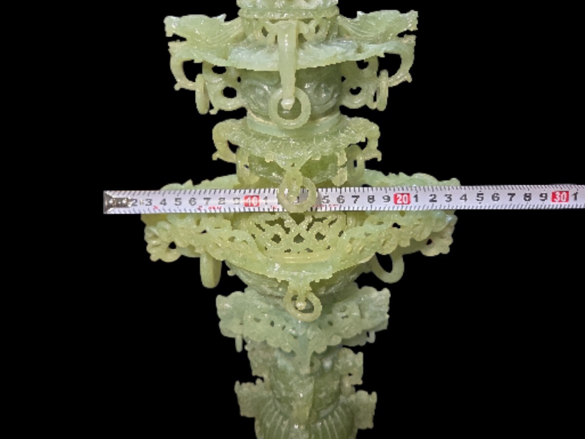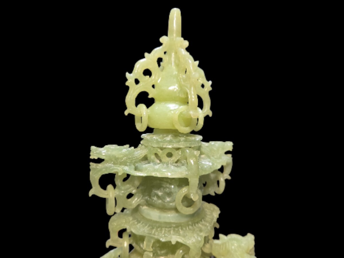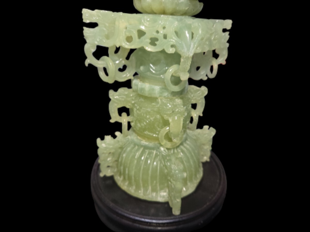 こちらは中国古玩 翡翠玉石 彫刻 龍耳透彫遊環付大香炉 唐木台付 高55cmでございます。