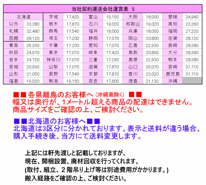 ◆静岡県袋井市からの出品です ◆ 静岡県袋井市からの出品です。 商品は、運賃(梱包費込)元払いでの発送です。 運賃は、以下の通りです。こちらの商品は、当社契約運送会社を利用し,、軒先渡しとなります。 お振込~納品まで1週間~2週間見てください。 沖縄県及び各県離島のお客様の場合、幅・奥行が1メートルを超える商品のお届けはできません。商品サイズをご確認ください。 ![]() ●商品のお預かりは落札後10日間とさせて頂きます。(期日を過ぎた場合、保管料を頂きます。) |
