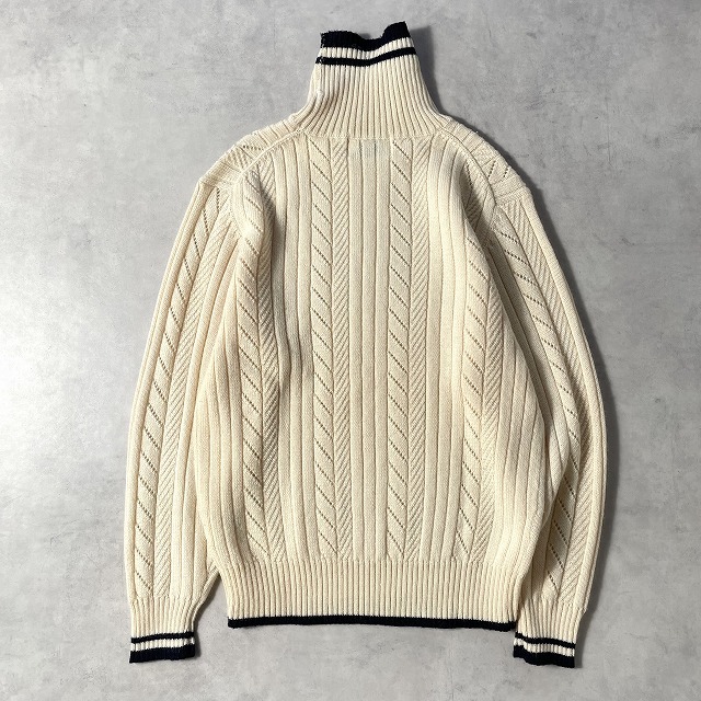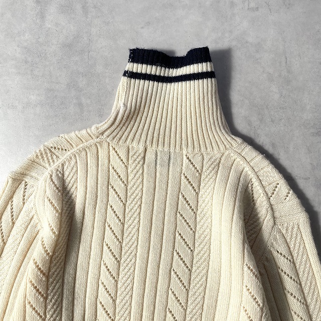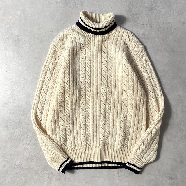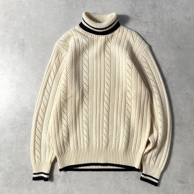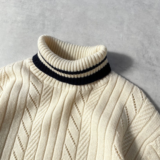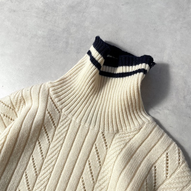 ウール100% ミドルゲージ 透かし編み リブ編み 配色 タートルネック ニット セーター