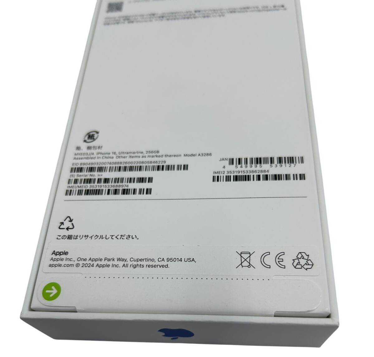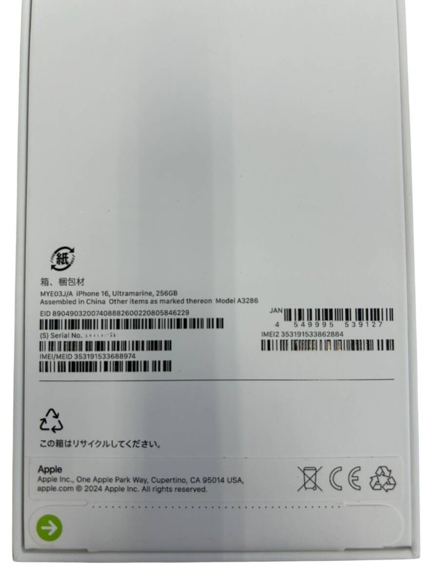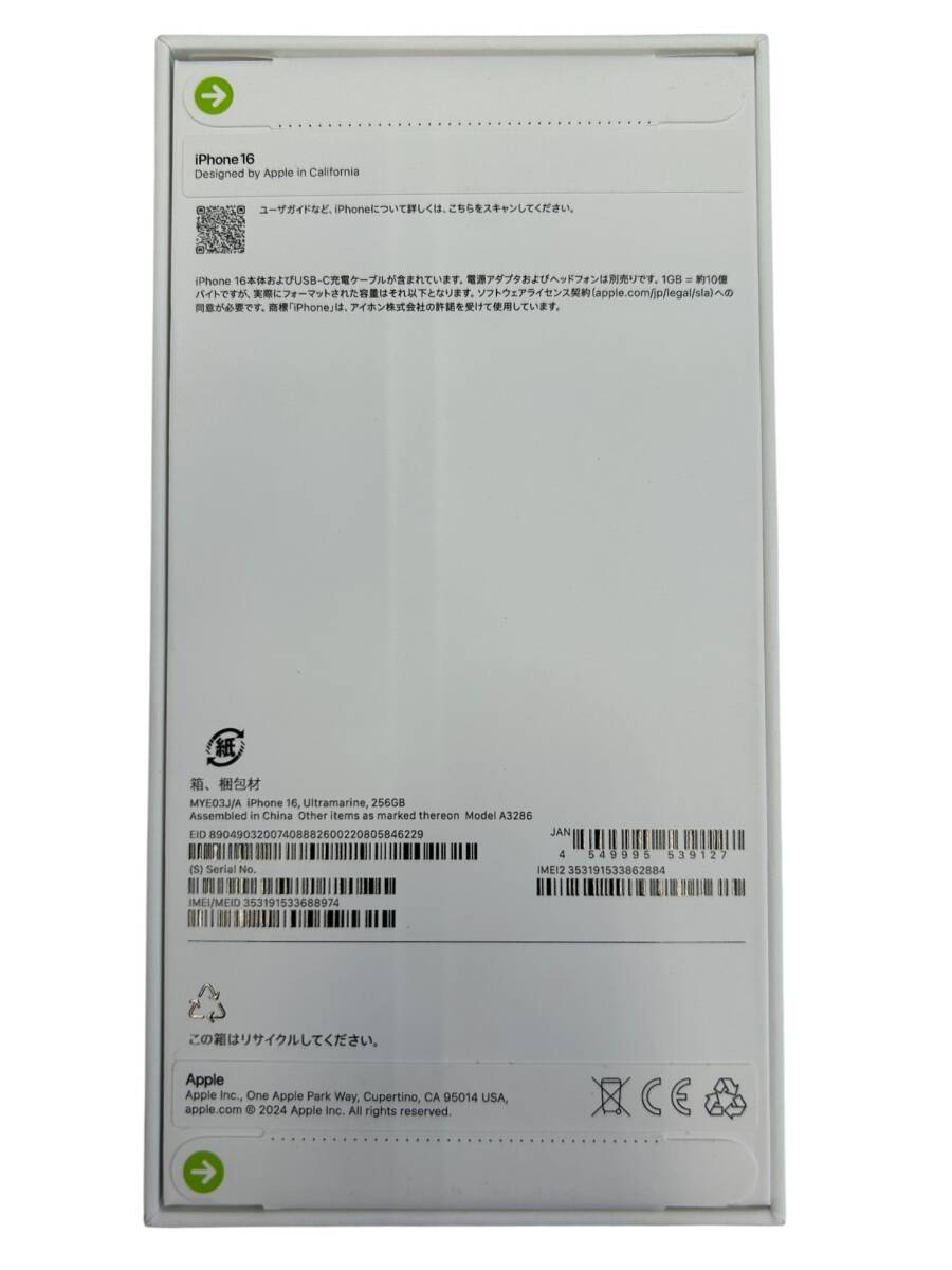 | 商品名 | 未開封 Apple iPhone16 256GB MYE03J/A A3286 ウルトラマリン IMEI- |