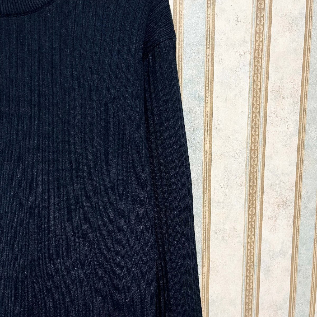 シンプルな無地タイプで、着回しやすさは抜群。襟元はベーシックな丸首仕様で、首元がすっきり見えるだけでなく、インナーとのレイヤードも楽しめます。全体に施された立体的なリブ編みデザインがポイント。単調になりがちな無地ニットに、ほどよい表情を加えてくれます。