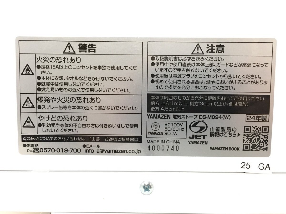 【R1-01014】山善 電気ストーブ DS-M094(W) 2024年製 ヒーター ホワイト 動作確認済み【千円市場】