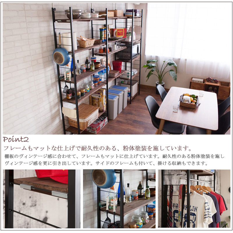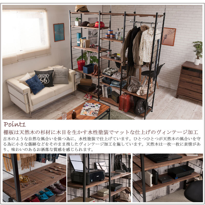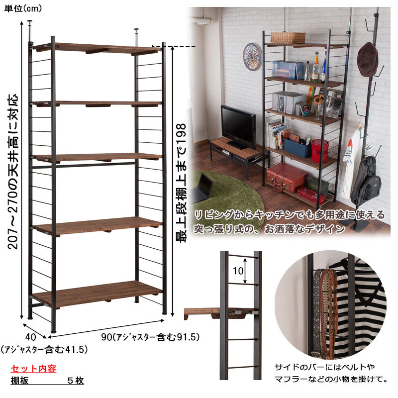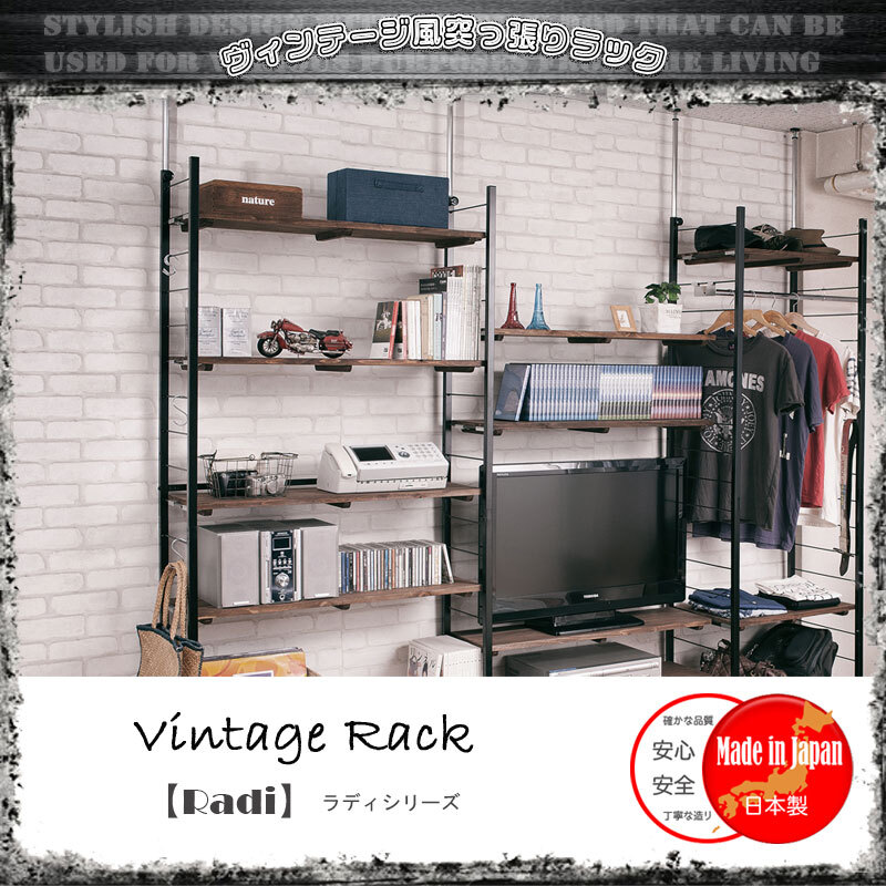 ■商品について/ヴィンテージな風合いの棚板を使用した『Radi』ラディシリーズ。突っ張り式で高い位置まで棚板をセットできるタワー型。棚板を10cm間隔で好みの位置に自由にセットできる楽しい家具。ディスプレイ空間とハンガーラックで見せるワードローブなどオシャレな店舗風にお部屋をイメージ。棚板はライン入りのデザインがオシャレで、杉材の天然木ならではの節・木目が雰囲気漂い、アジアンにも西海岸テイストにもはまるオシャレアイテムで自宅をカフェ風に。同素材で仕上げたキューブBOX【Dice】ダイスシリーズ、棚が浮いたイメージ突っ張りラック【Move】シリーズも是非!