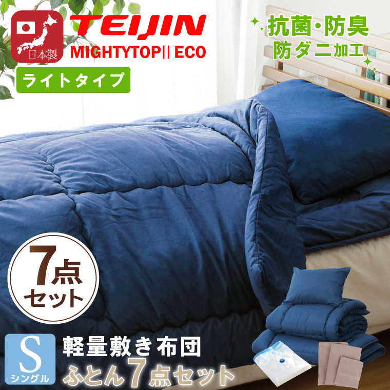 ・抗菌・防臭・防ダニわたを使用したこだわりたっぷりのシングルサイズ国産布団セット(掛け・敷き・枕)です。収納用の圧縮袋付きです。ピーチスキン生地使用で肌触りがとってもなめらか。 ・テイジン製の抗菌・防臭・防ダニわた「マイティトップII ECO」を使用。様々な試験で安全性も確認されており、エコ素材を使うことで環境にも配慮。生地の裏側には不織布も一緒に縫い合わせているため、中からわたが吹き出しにくく、とても快適にご使用いただけます。 ・注文をいただいてから国内工場で生産しているので、出来立ての布団をお届け。ご希望でサイズの変更を承ることもできます(別途費用がかかります) ・発送の際、圧縮してお届けしております。再利用できる圧縮袋を使用しているので、使わない際はコンパクトに収納も可能です。 ・創業65年続く国内の布団工場にて熟練の職人がひとつひとつ丁寧に手作り。国内メーカーの検針機にて2回の検針、2回の検品を行っているので、安心してご使用いただけます。この機会に是非お試しください! | |