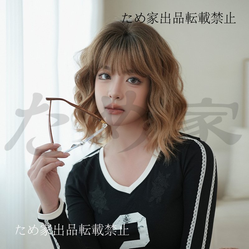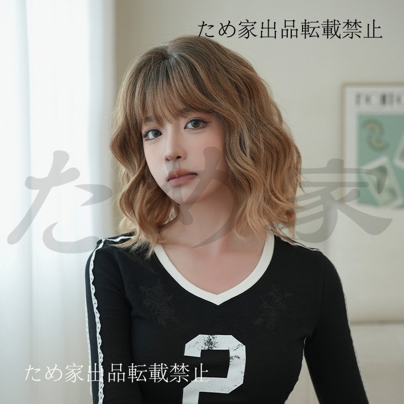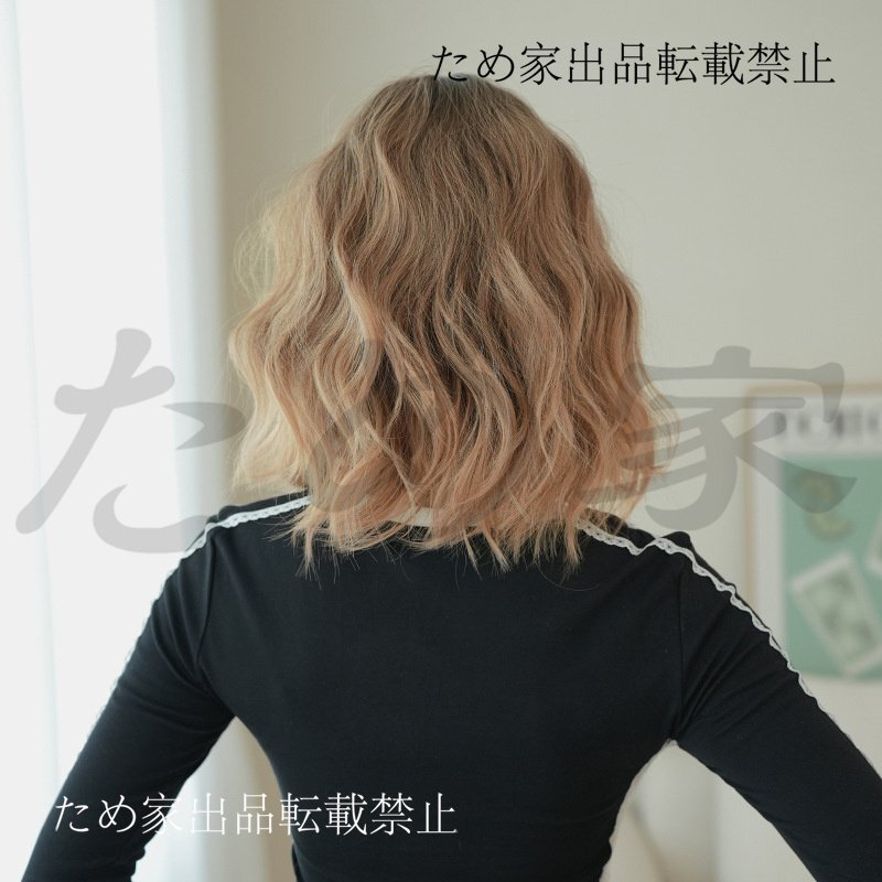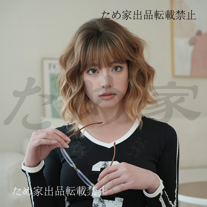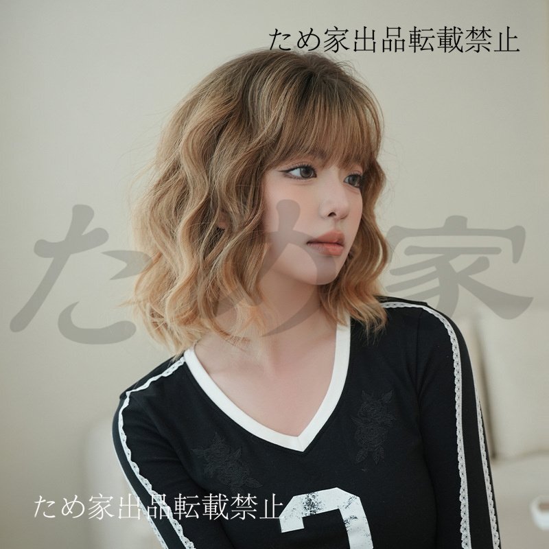 新品人毛 ショート巻き髪ウィッグ トップグラデーション オレンジゴールドカラー つむじ部分手植え 自然に見えますフルウィッグ