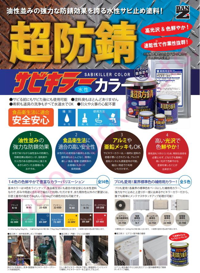 サビキラーシリーズ【最強の防錆効果】を誇る水性塗料 高い光沢の鮮やかな仕上がり&速乾性で作業性も抜群 しかも食品衛生法適合の高い安全性を実現!! | ||||||||||||||||||||||||||