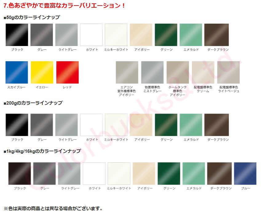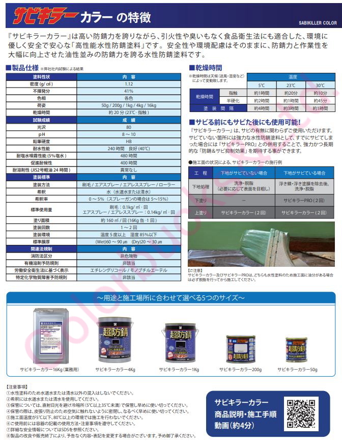 【1】溶剤並みの強力な防錆効果 サビキラーカラーは水性塗料でありながら、溶剤塗料並みの防錆力を有しております。 防錆効果を高めたいが、不快な溶剤臭を避けたい or 引火性のある塗料を使用する事ができないと、 これまで防錆塗料の施工を諦めていた御客様におススメです。 【2】食品衛生法適合の高い安全性 サビキラーカラーは水性塗料のため引火性もなく、使用された器具も水洗いが可能です。 また、食品衛生法 適合(おもちゃの製造基準)の高い安全性を有しております。 また、臭いも殆ど発生しないため臭いに厳しい食品/養殖/飼育/空調関係の御客様などにも多数ご採用頂いております。 ※注意:食品衛生法適合に関しましては、完全乾燥後の塗膜に対するものとなります。 塗料(液体)の性状が食品衛生法に適合しているものではございません。 決して塗料を飲用されませんよう御注意ください。 【3】強力な付着性 鉄部は勿論、一般的に塗料の密着が悪いとされる亜鉛メッキ鋼板やアルミ鋼板に対しても直接塗布頂けます。 【4】抜群の作業性 指触乾燥約10分(温度 30度の場合)速乾性に優れている為、作業性が良好です。 【5】刷毛目が出にくく、キレイな仕上がり 一般的に水性塗料では、刷毛塗りの場合、塗膜表目に刷毛目が出やすくなる問題がございます。 しかし、サビキラーカラーではこれらの問題を解決。 プロの職人でなくとも刷毛目が出にくくキレイに仕上げる事が可能です。 【6】サビキラープロとの併用でオール水性防錆を実現 一般的に錆転換・防錆は油性(溶剤)が主でした。 しかし溶剤臭により、臭い移りの心配や、火気厳禁の場所では中々使いづらいもの… サビキラーPROとサビキラーカラーは共に水性ですので、 火気厳禁の場所や臭い移りが厳禁な場所でも安心して錆対策を実現する事が可能です。 | ||||||||||||||||||||||||||