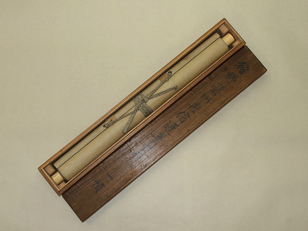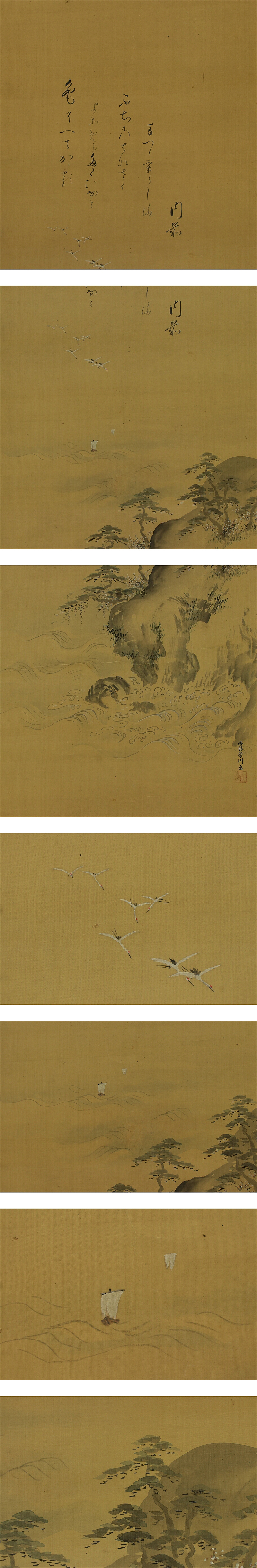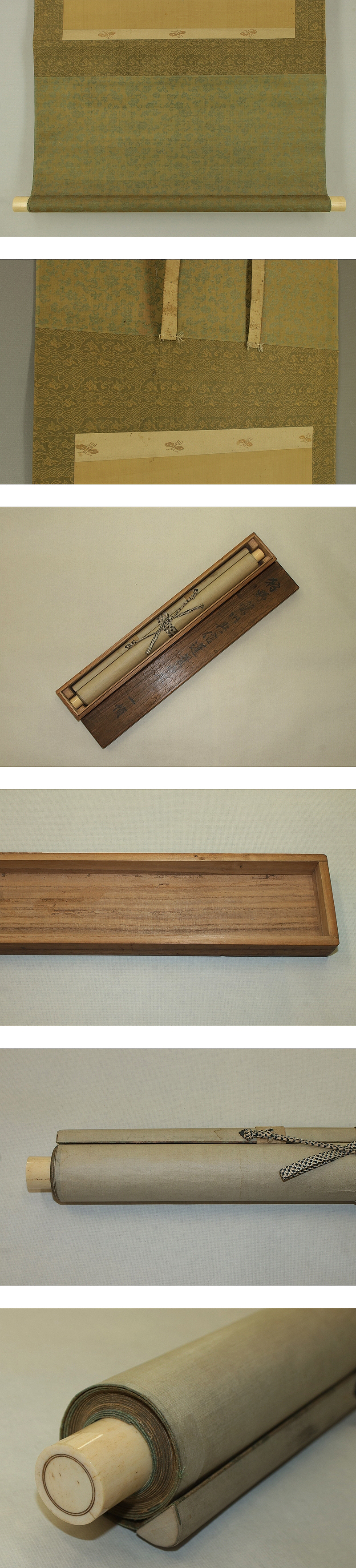 狩野栄川院典信 かのうえいせんいんみちのぶ(1730-1790) 江戸中~後期の狩野派の画家。 号は白玉斎。木挽町狩野家6代目で、父は狩野古信。子は木挽町狩野家7代目の狩野惟信。 寛政2年の内裏造営に際し、絵師として最高位の賢聖障子絵を制作。 木挽町狩野家が繁栄する基礎を作った。 本紙は、染み、汚れ、折れ、皺、ヤケ、破れがあります。 表装は、染み、汚れ、強めの折れ、皺、ヤケ、ほつれ、修復痕、風帯に傷み、 軸先に傷み、箱に虫食いがあります。 【サイズ】 作品 横約38.5cm×縦約101cm 表装 横約48.5cm×縦約190cm |