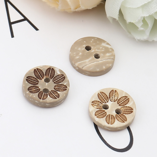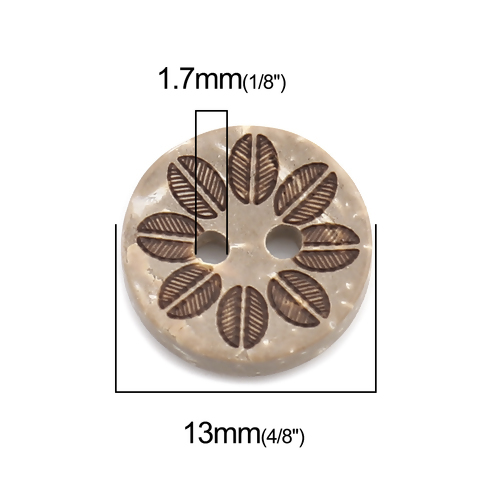◆ボタン/5個入◆ココナツ殻製/新品◆MADE IN CHINA◆実物と画像では多少色合いが異なりますサイズ(約):13mm 厚2.9mm 糸通し穴1.7mm