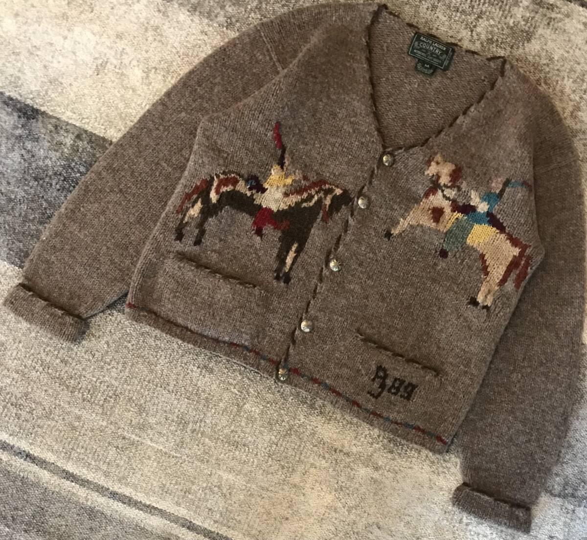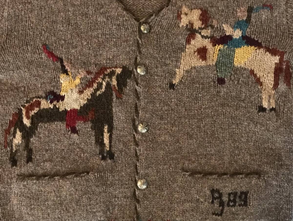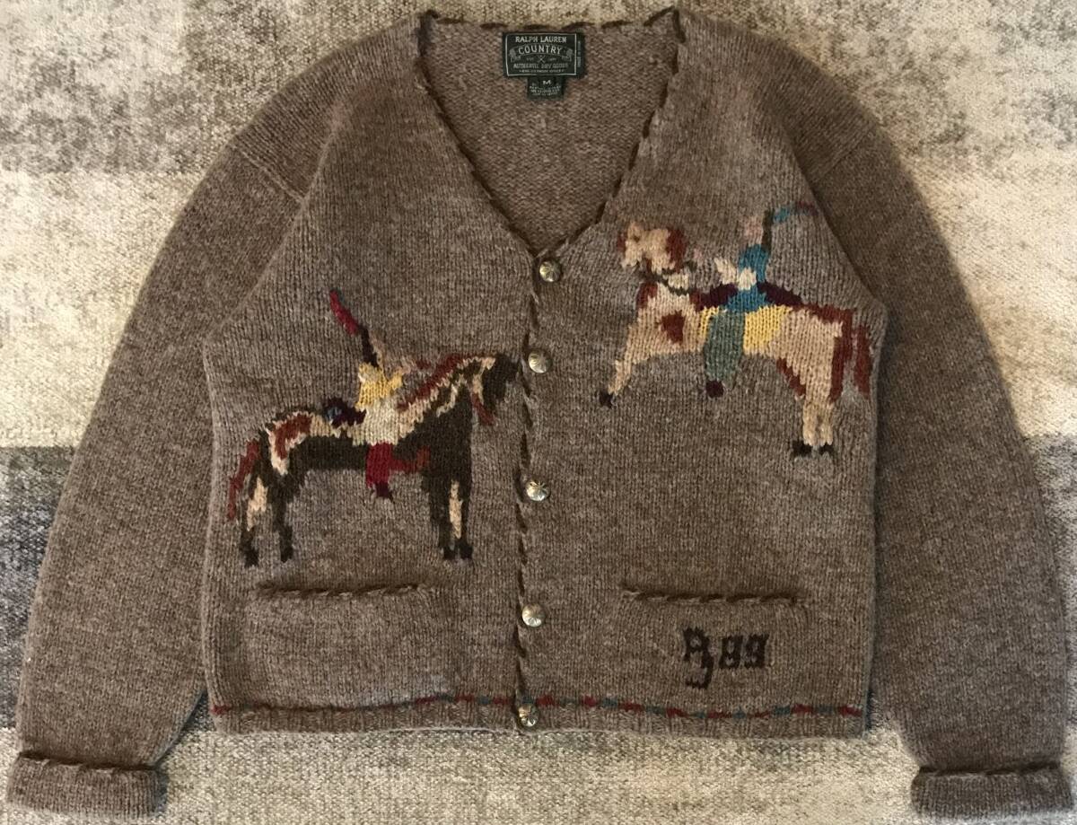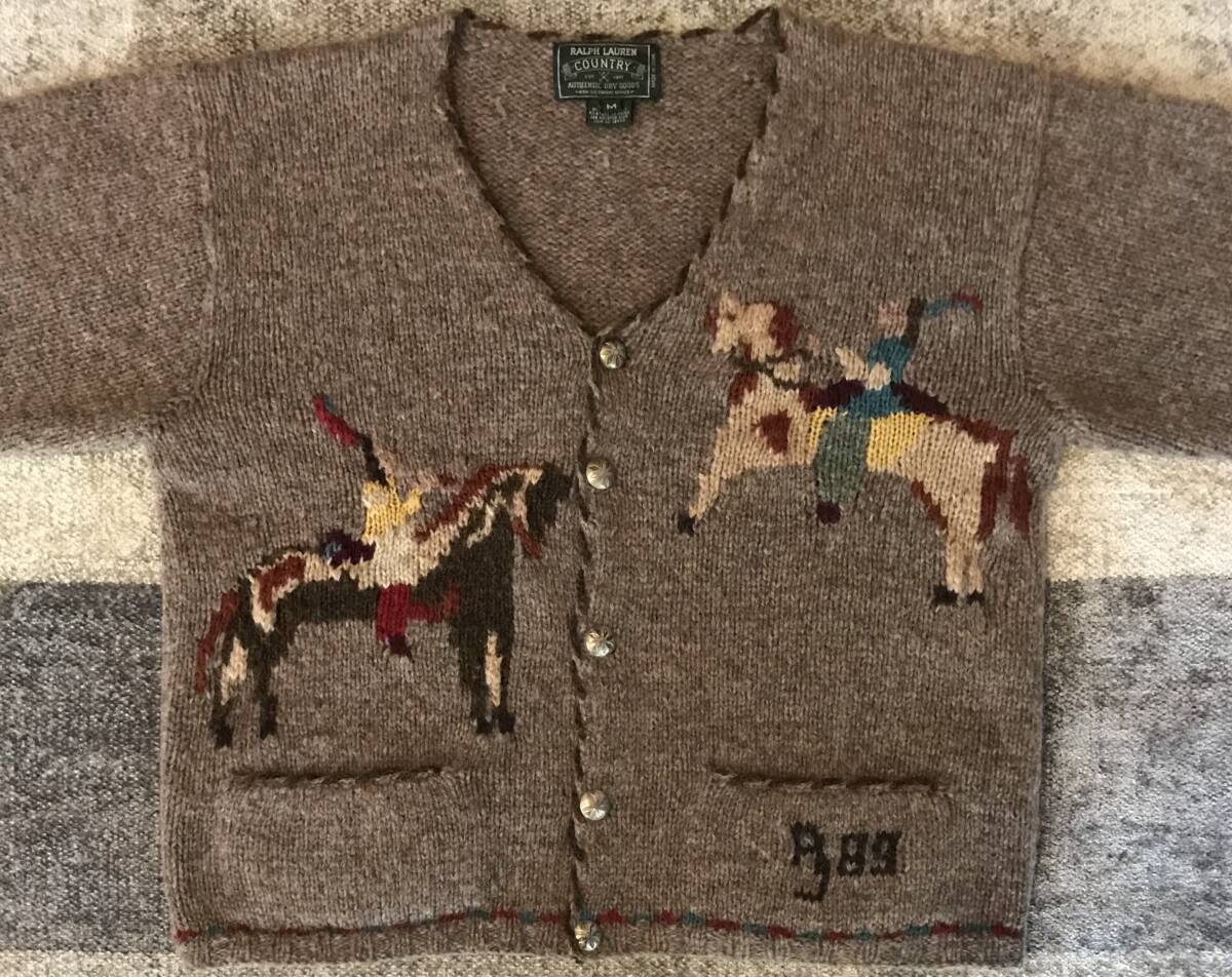 幻の逸品 超レア 圧巻のデザイン 89年製 当時物 80's vintage ★ RALPH LAUREN COUNTRY ★ ラルフローレン カントリー ネイティブアメリカン 乗馬柄 ミックスカラー ニット カーディガン M です。