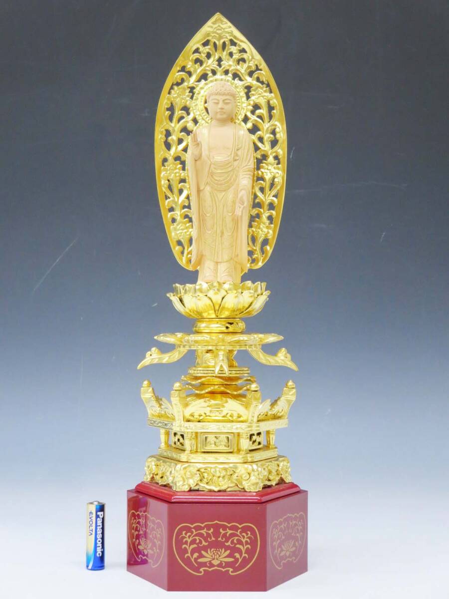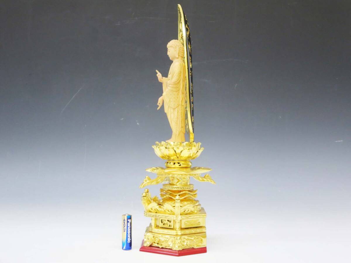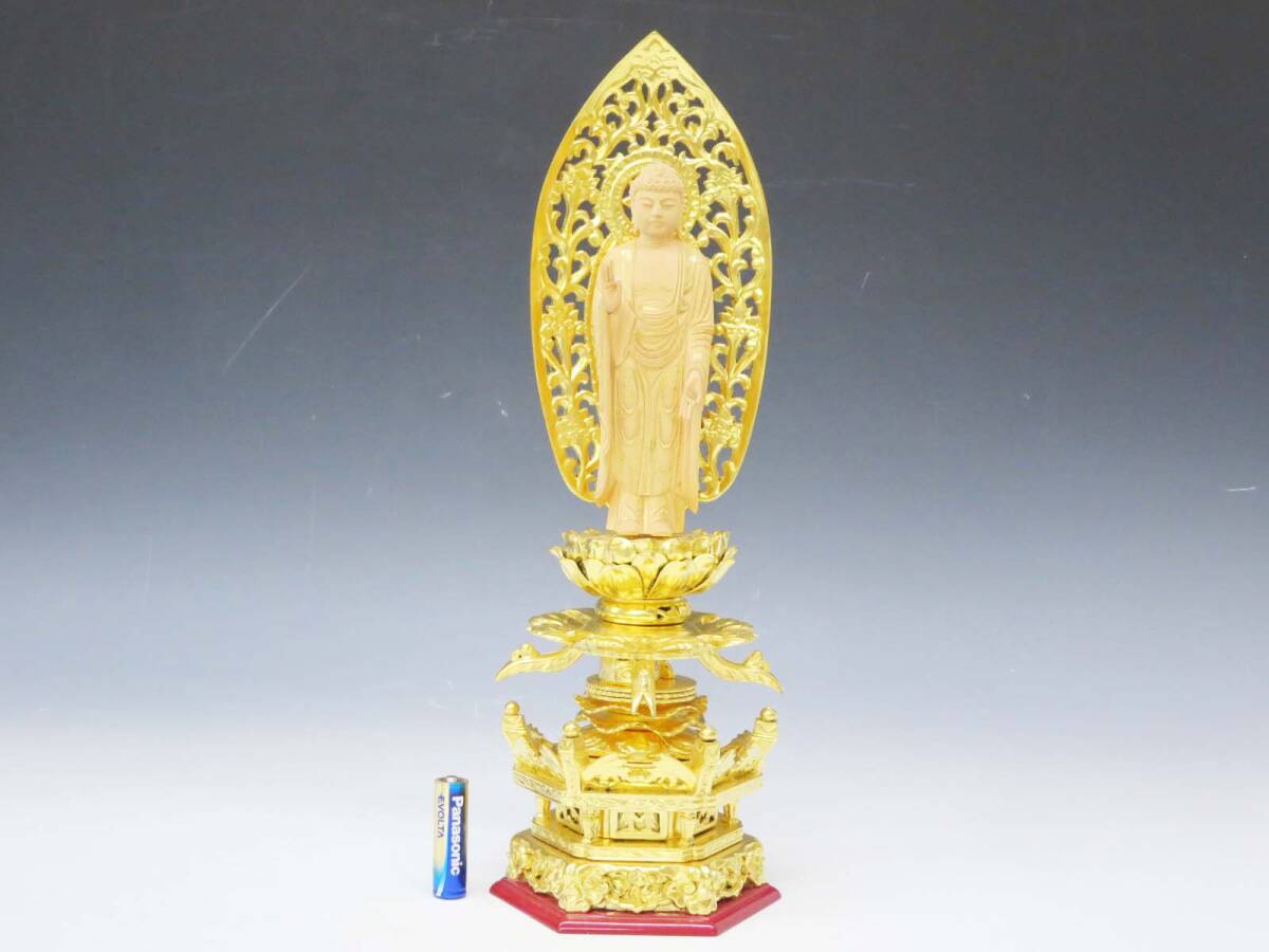 ◆(EG) 浄土宗 ご本尊 舟立阿弥陀如来 仏像 工芸品 柘植? 純金箔? 金泥? 六角台座 唐草光背 立像 仏教美術 仏壇 仏具