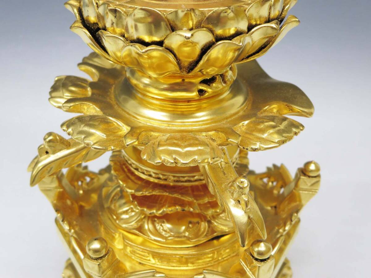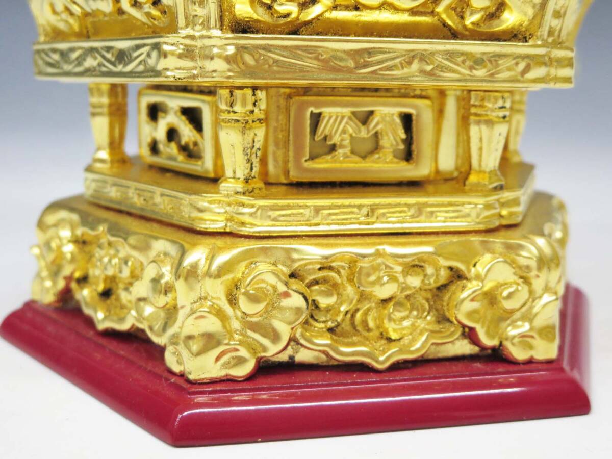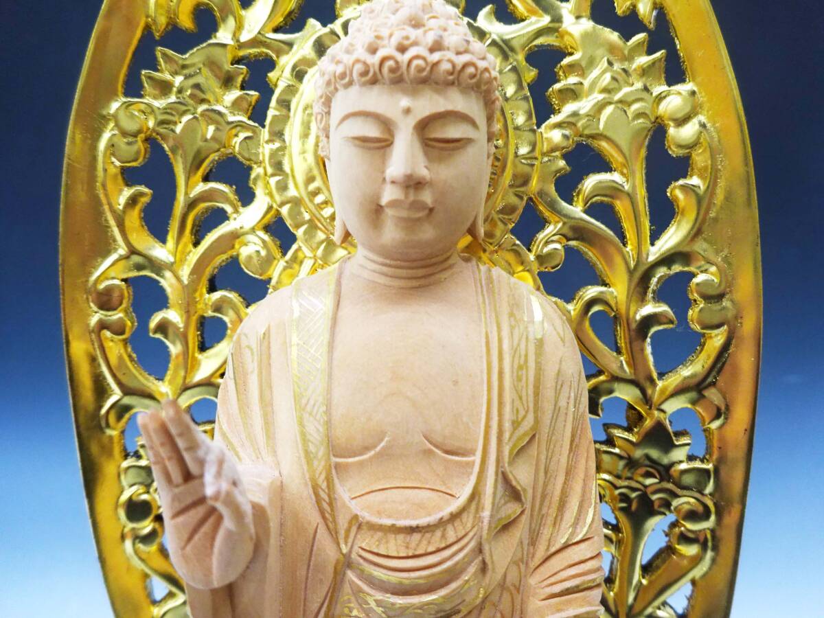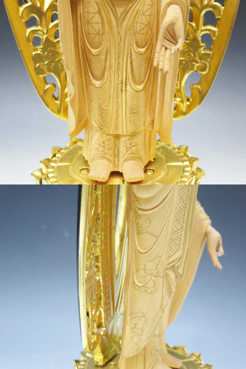 ◆(EG) 浄土宗 ご本尊 舟立阿弥陀如来 仏像 工芸品 柘植? 純金箔? 金泥? 六角台座 唐草光背 立像 仏教美術 仏壇 仏具